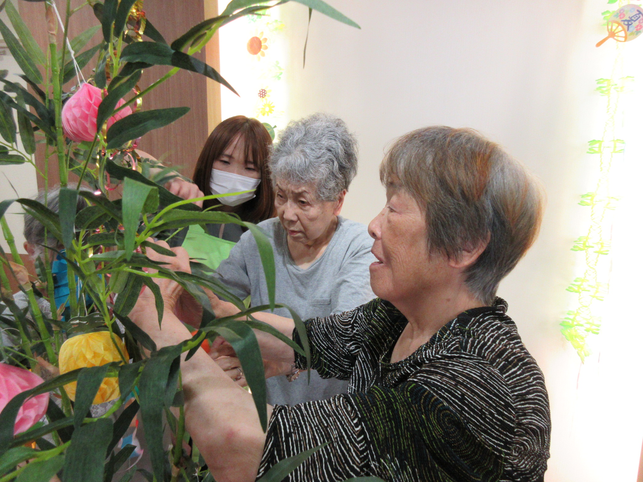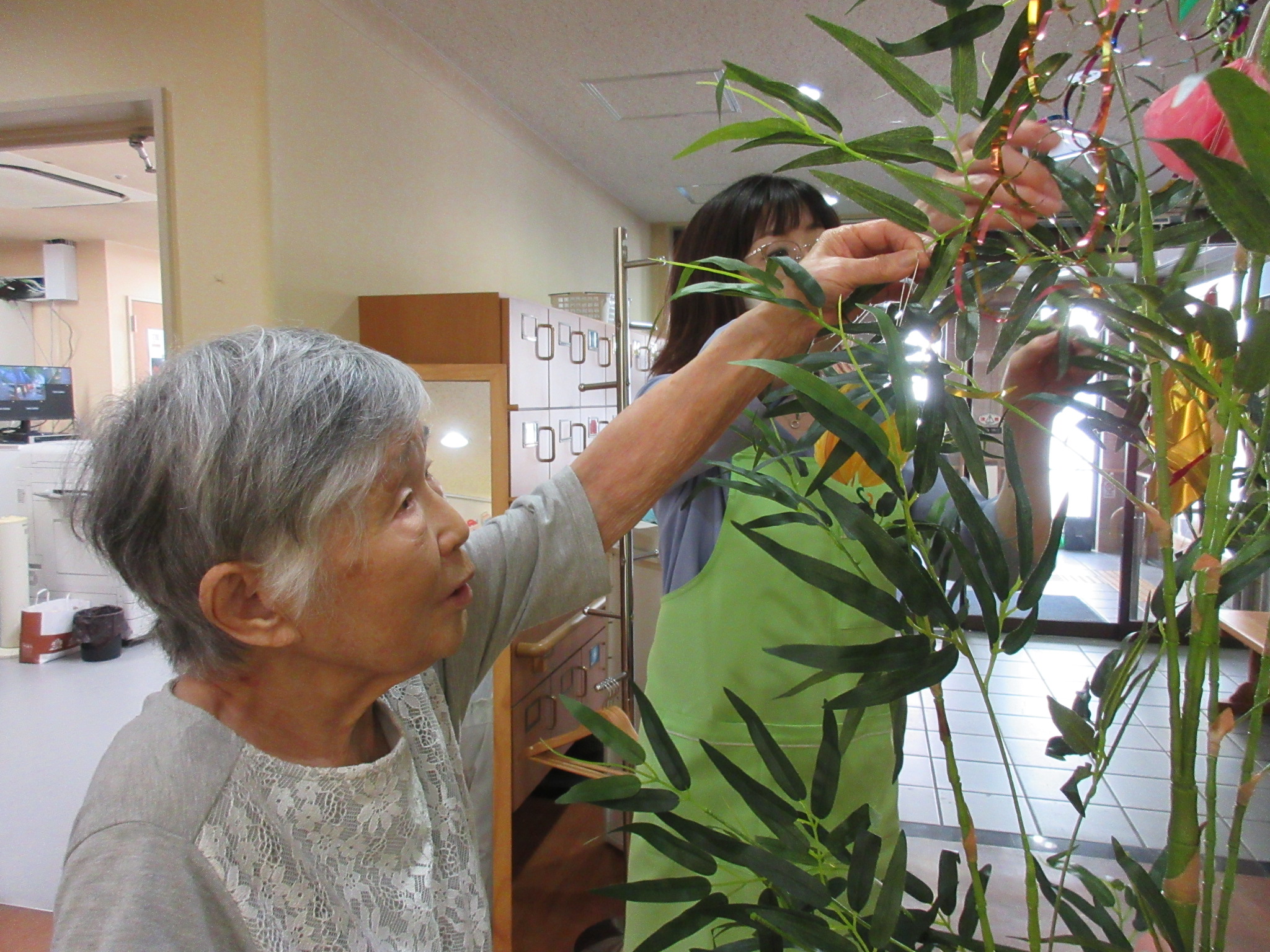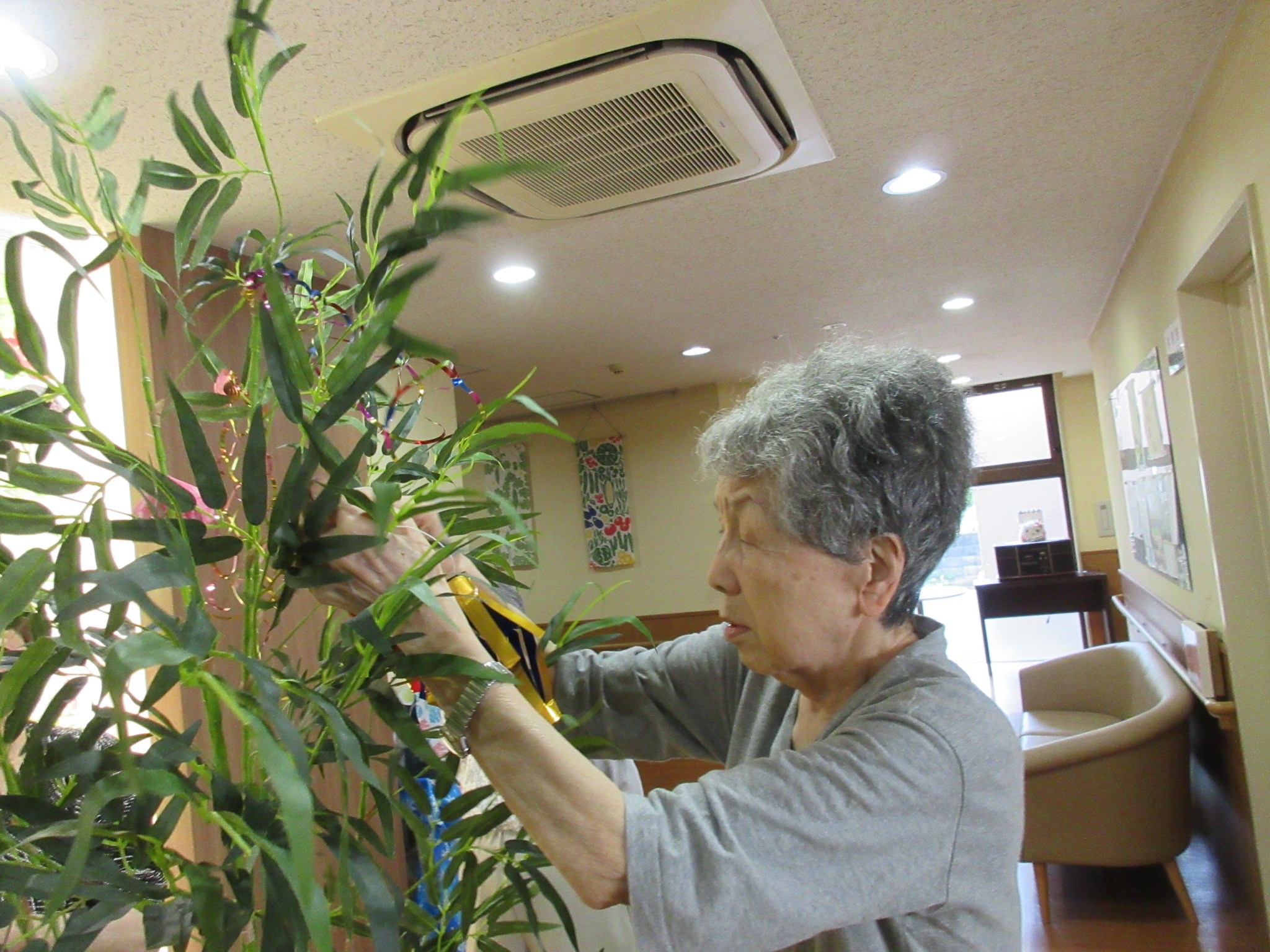 今日は8月の七夕に向けて、ご入居者と笹の葉に飾り付けをしました。