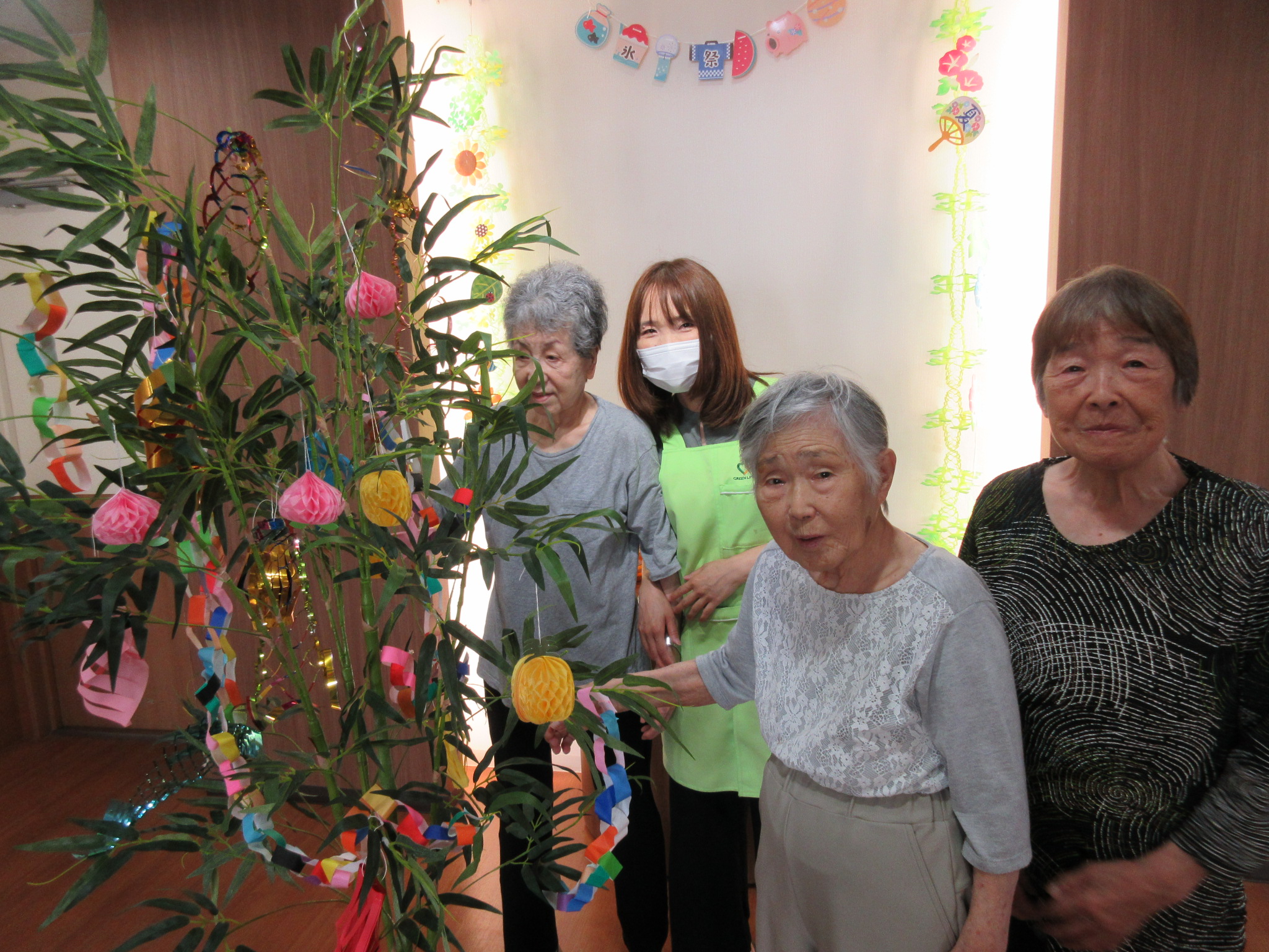 今日は8月の七夕に向けて、ご入居者と笹の葉に飾り付けをしました。