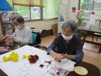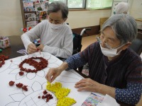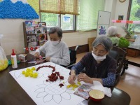 1階では花紙を使ってブドウ棚、赤鬼青鬼、桜の木など季節にあった作品を入居者様に手伝ってもらいながら作っています。