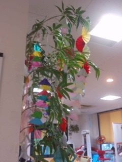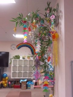 こんにちは、シーハーツ柏です。短冊が完成し、笹に思いを託します。こちらも入居者様に協力をお願いし、七夕の飾りつけをしました。「こうやって笹の葉に吊るすんだね。たくさん短冊があるね。」と、入居者どうし作業が弾みます。青々としたきれいな笹ですね!「家族の健康を願います」「元気に歌いたい」「長生きしたい」など、願い事は様々です。