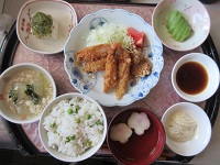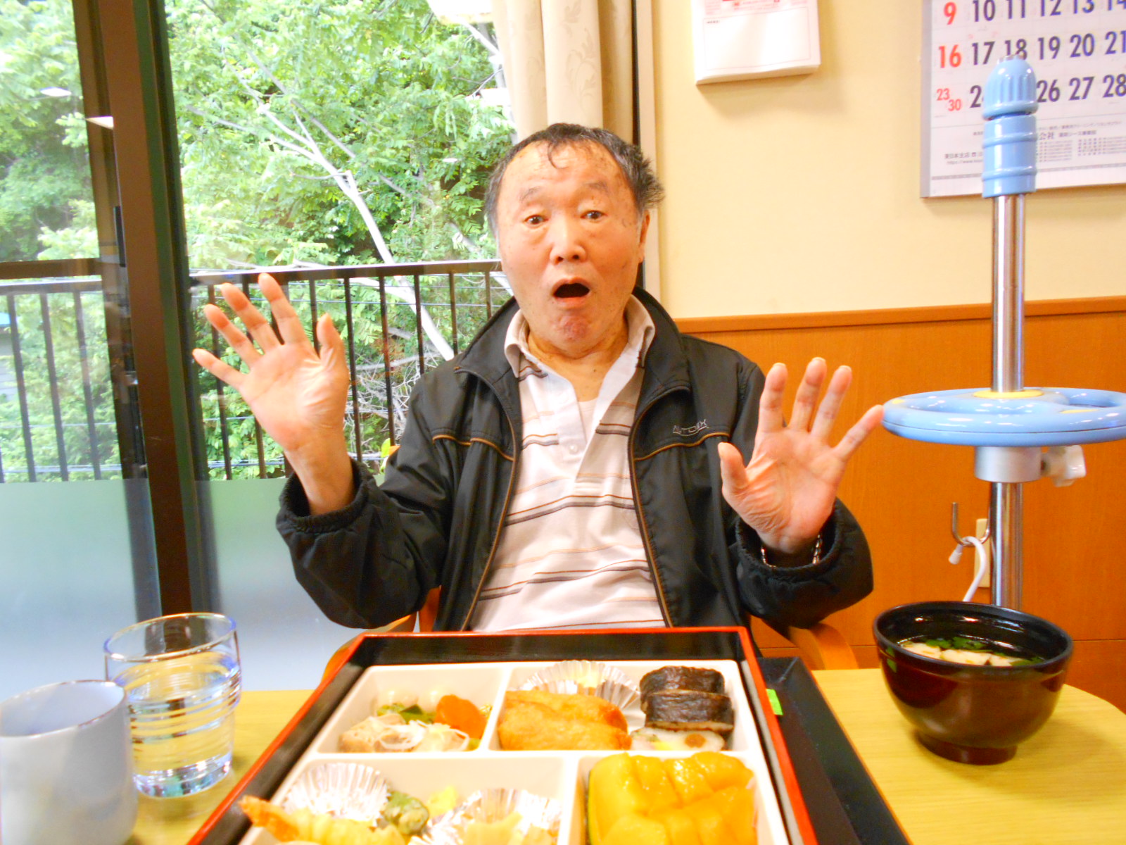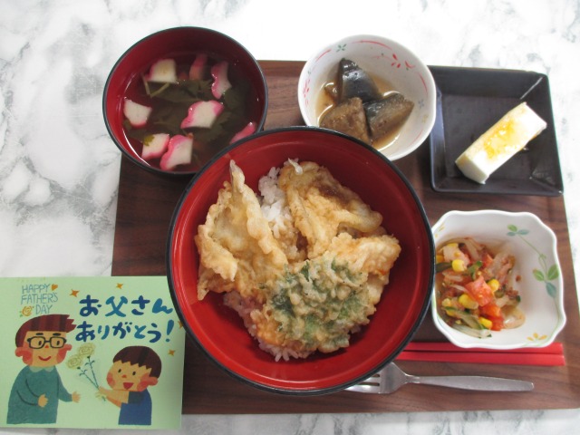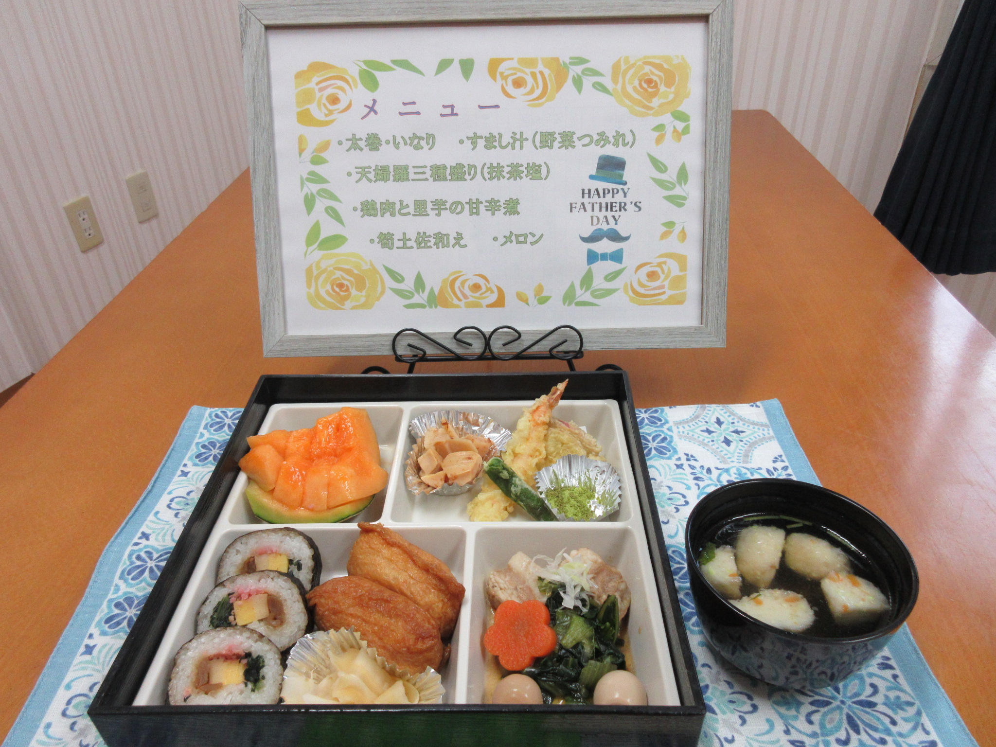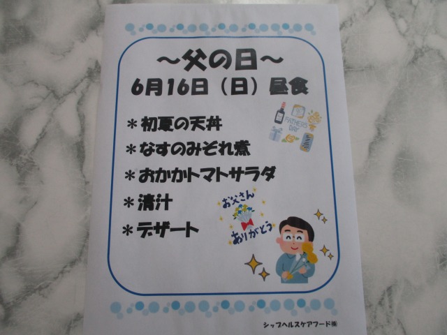 お昼ご飯はボリューム満点の父の日メニュー!! はぴねのお父さん達は「おいしいなー」とモリモリ食べていましたが、女性の方々は「多いねー。お腹いっぱい・・」とギブアップされていました( ̄▽ ̄;)