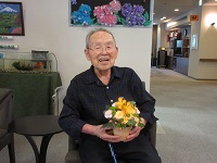 「これ、もらったんだけど、世話できないから頼むよ」と仰っています。お部屋でお水をあげることを提案しますが「みんなに見てほしい」との希望で施設の正面玄関に飾らせていただいています。素敵な笑顔をありがとうございます!