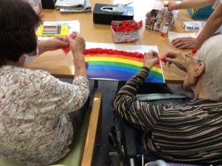 今日の午後は皆さんが楽しみにしている音楽療法日です♪「梅雨」を想定して先生が「雨」に関する歌を沢山選んでくださいました。「あめふり」「雨降りお月さん」を皆さんで歌い、「かたつむり」の歌で手を動かし、足を動かし身体をほぐしました。「瀬戸の花嫁」では鈴、マラカス、太鼓、タンバリンを使い皆さんで演奏して盛り上がりました。最後は「星影のワルツ」で締めくくり「今日も楽しかったです」と皆さん言われていました。次回も楽しみですね( *´艸`)