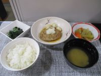 「おろしハンバーグ」「ふきの煮物」「ほうれん草の生姜和え」「ごはん」「味噌汁」です🍚