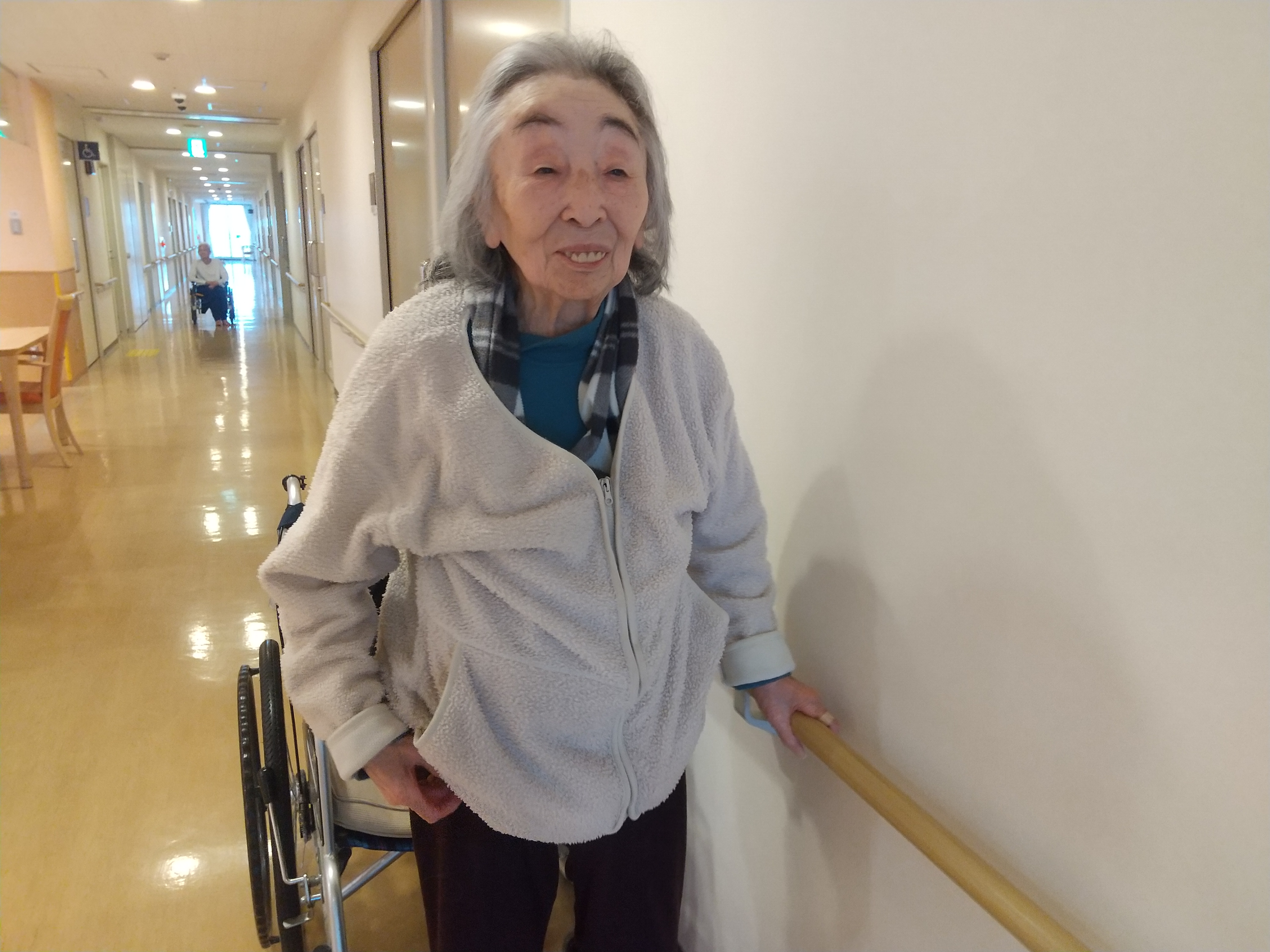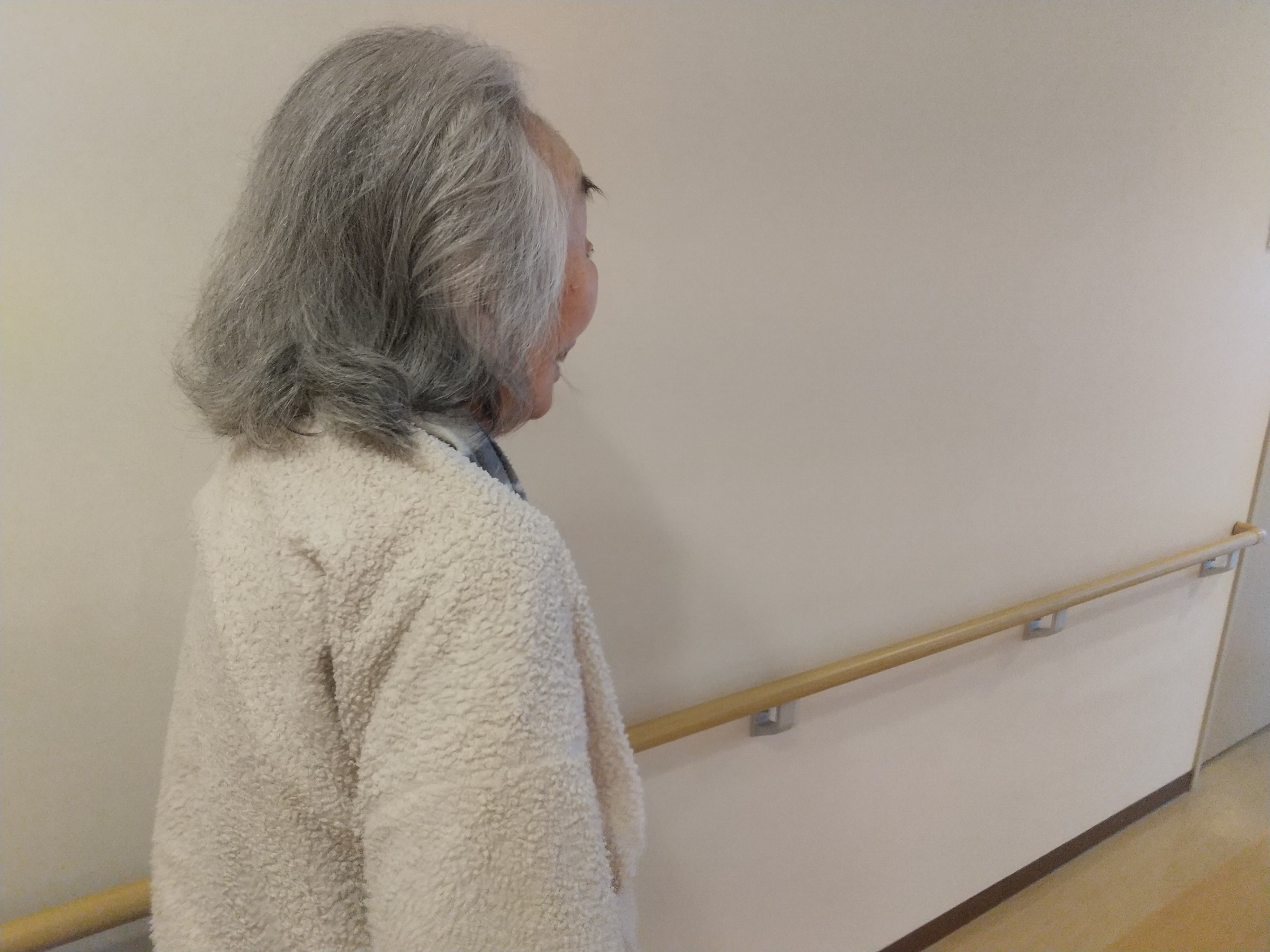 手すりを使い歩行運動中、
