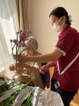 こんにちは、シーハーツ柏です。 3月の生け花の様子になりますが、普段とは違う雰囲気で、お部屋で生け花を実施しました。「これじゃあ、茎が長すぎるかしら。」と、スタッフと一緒に相談しながら進めます。 「同じコデマリでも、短いのと、長いのを生けるときれいですね。」とスタッフがアドバイスをします。 馴染みの空間で個性あふる作品が仕上がり、お部屋の入り口に飾った作品を見返す楽しみも、生け花の醍醐味ですね。