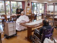 面会に来て下さる中には、ワンちゃん(家族)を連れてこられる方もおります。入居者様も笑顔見られ大変喜ばれております。