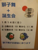 1/14(日)に新年会と称して、獅子舞の登場と誕生日会を実施します!