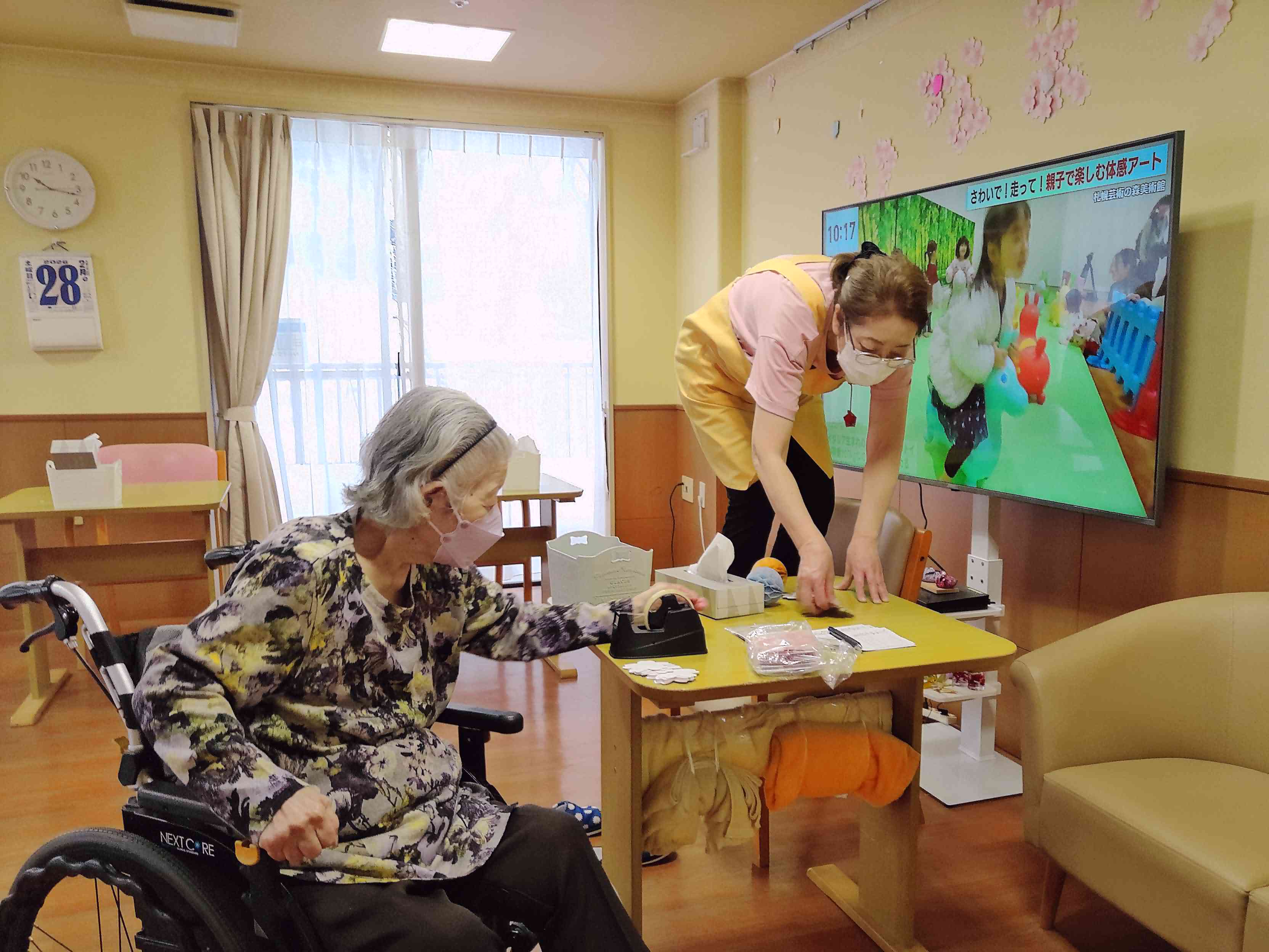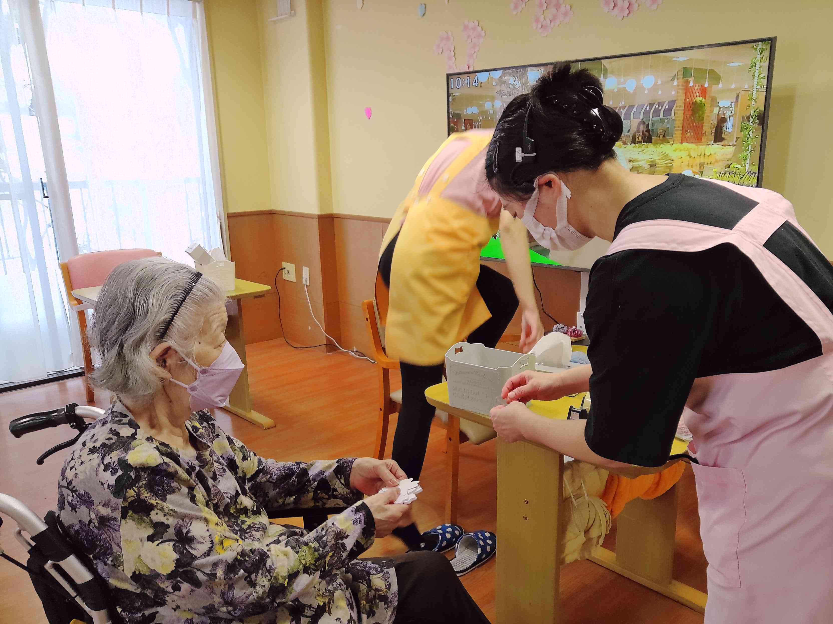 入居者様が桜のカードにテープを貼ってくれて、それを職員が壁に貼っていく!