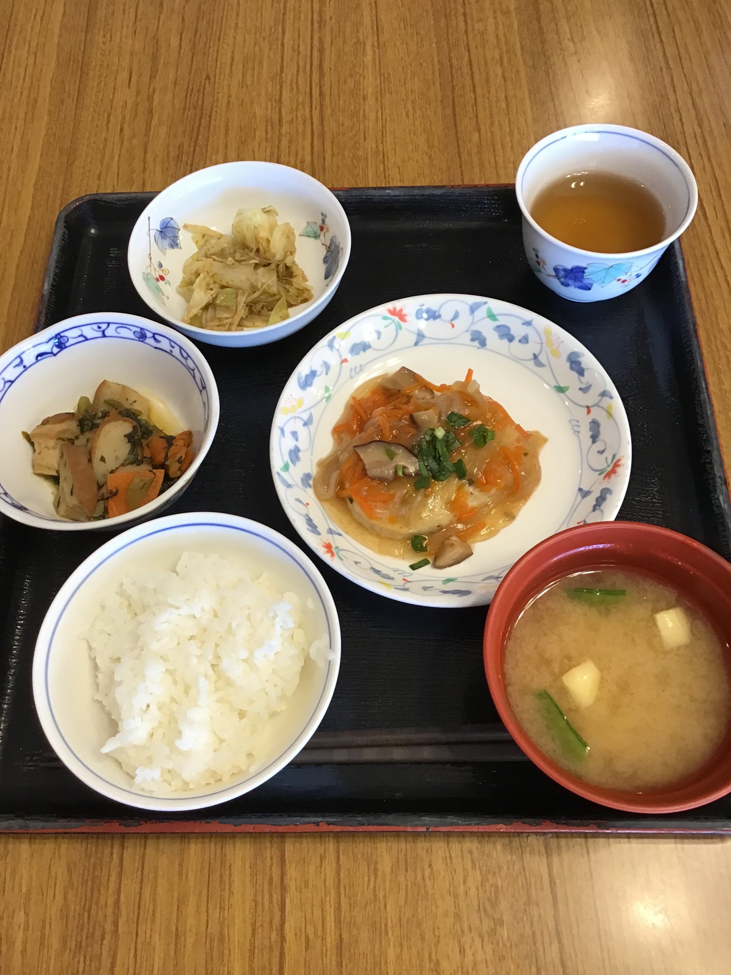 献立のメニューは、豆腐ハンバーグ野菜あんかけと車麩の煮物、キャベツの海苔和えです。