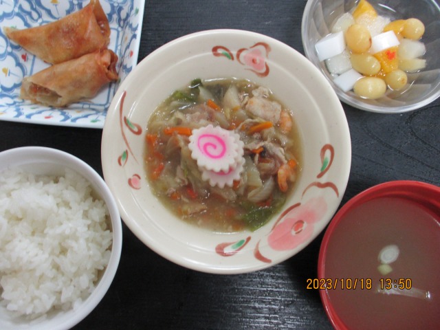 本日のランチを紹介します♪ 『八宝菜・春巻き・中華スープ・ごはん・フルーツ杏仁豆腐』の中華定食でした♪ 皆様、とても美味しそうに召し上がっておられました(*´▽`*)