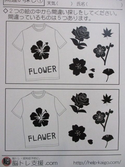 明日のあたまの体操の問題を紹介します♪ こちらは『間違い探し問題』です♪ 2つの絵の中に間違いが5つ隠れています。パッと見ただけでは分からないのでしっかり見ることで集中力を鍛えることが出来ます(*´▽`*)