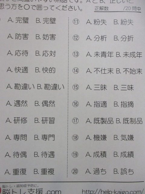 明日のあたまの体操の問題を紹介します♪ こちらは『間違いやすい漢字問題』です! 普段、本や新聞で何気なく読んでいますがいざ漢字を見比べてみると「どっちだったかな?」と分からなくなります。しっかり見比べて回答していきましょう(^_-)-☆