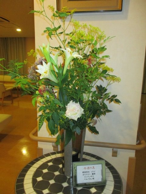 エントランスのお花が新しくなりました♪ 『鉄砲百合』『ソケイ』『オミナエシ』『藤袴』『リシアンサス』『ベルベロン』等です♪ 今週も入居者様がお花の絵を描いておられました(*´▽`*)