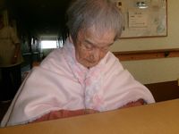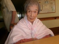 101歳の淑女♪ 寒いと仰られる為、この猛暑もエアコンの聞いたリビングでは長袖シャツの上に肩掛けをして過ごされました(^_^;) 「真夏でぇ~??」「年取ると寒いんや!!」のやり取りが何度繰り替えされたか♪ こっそり証拠写真を撮るつもりがフラッシュで気付かれてしまい、正面から撮影すると一瞬、ニヤッとされてしまいました♪