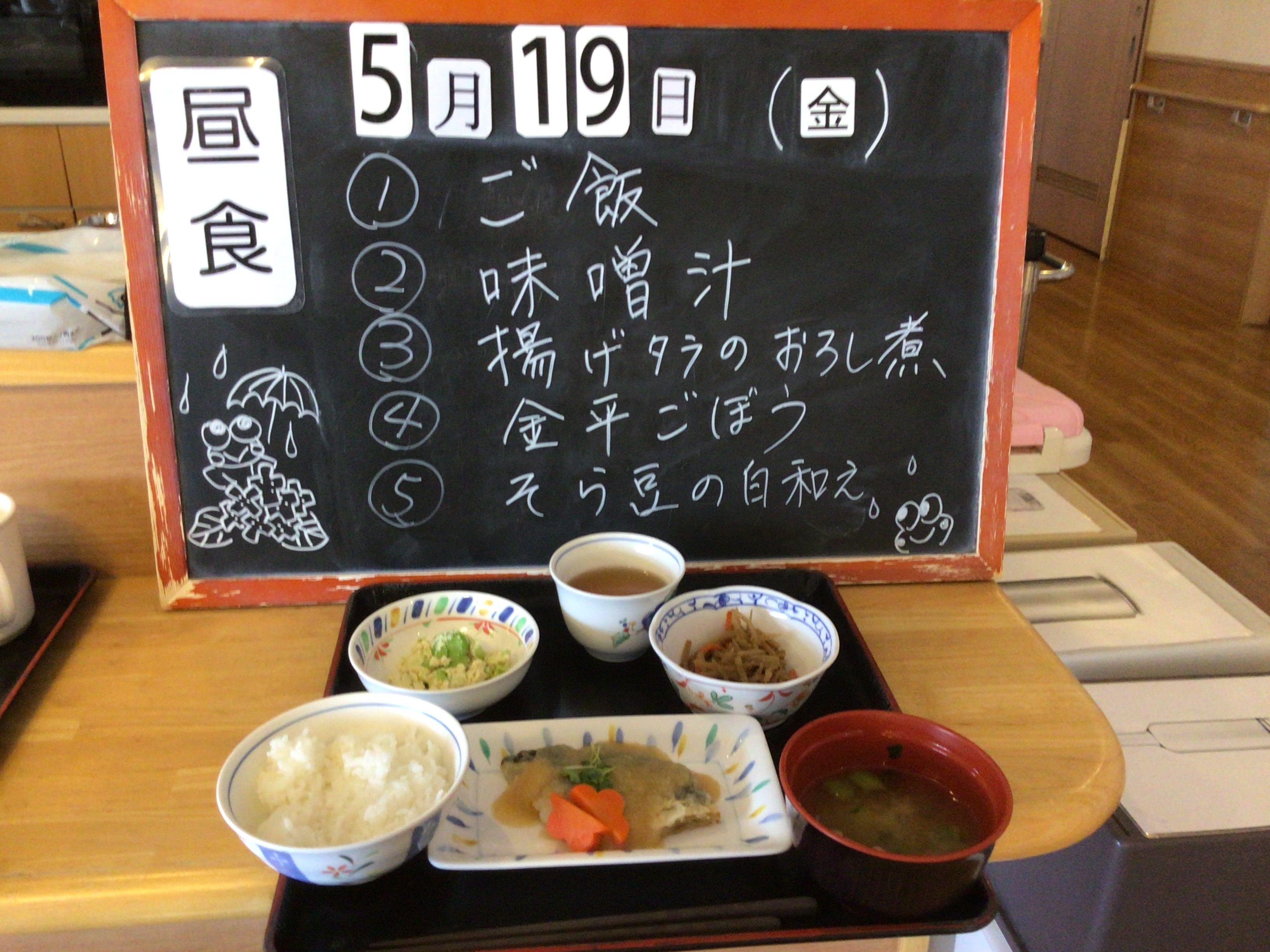献立のメニューは、揚げたらのおろし煮と金平ごぼう、そら豆の白和えです。