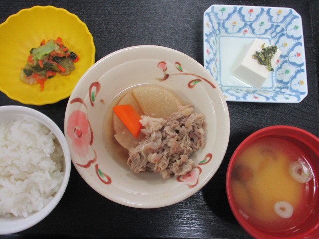 本日のお昼ご飯をご紹介します♪ 『牛バラ大根煮』『チンゲン菜の和え物』『冷奴』『ごはん』『お味噌汁』の栄養バランスの良い和定食です♪ヘルシーでとても美味しそうです(*´▽`*)