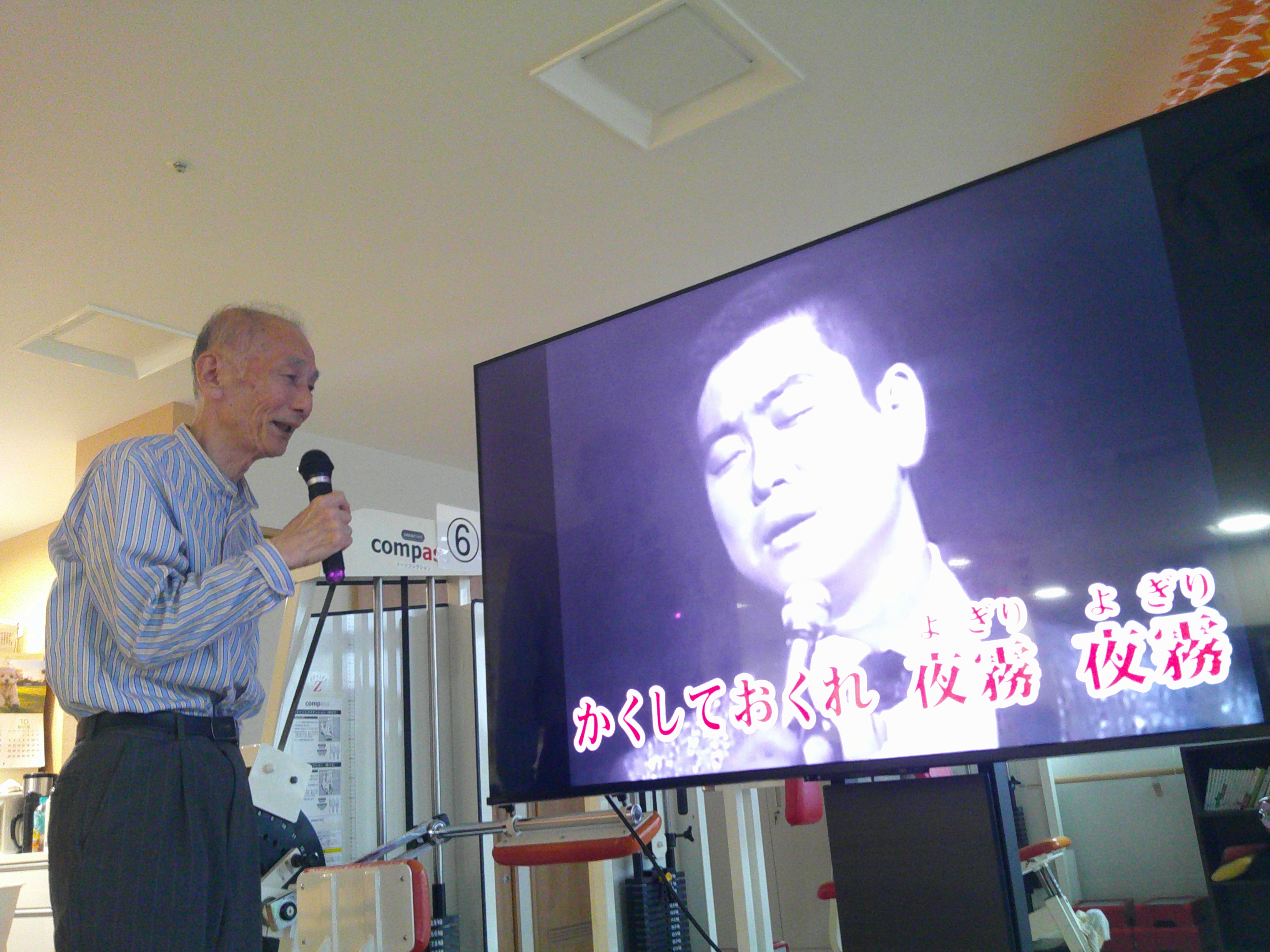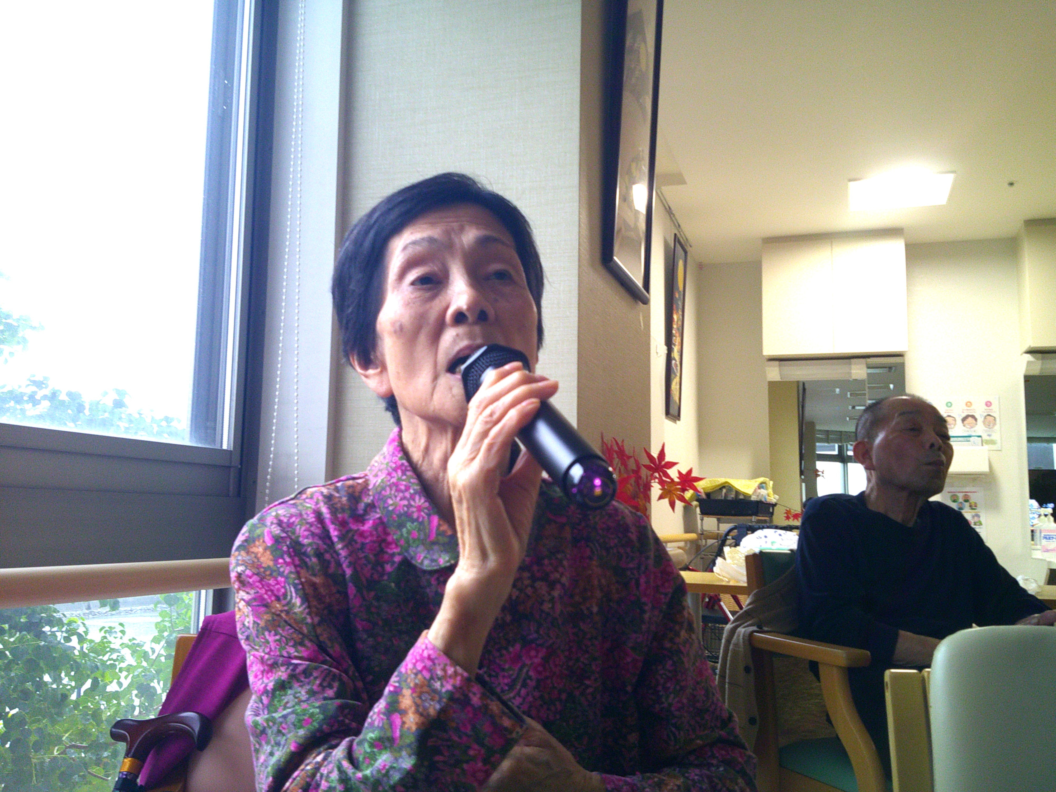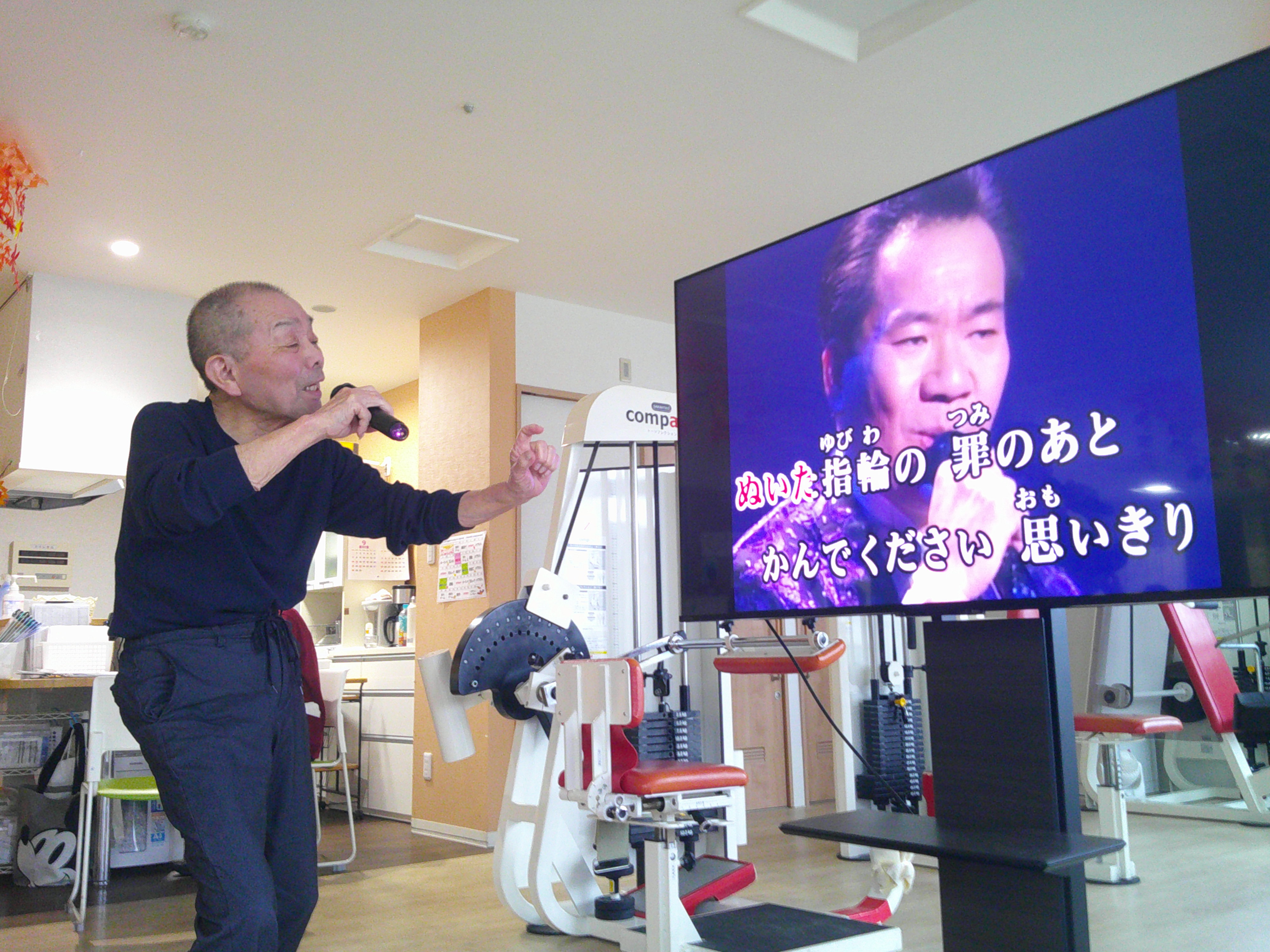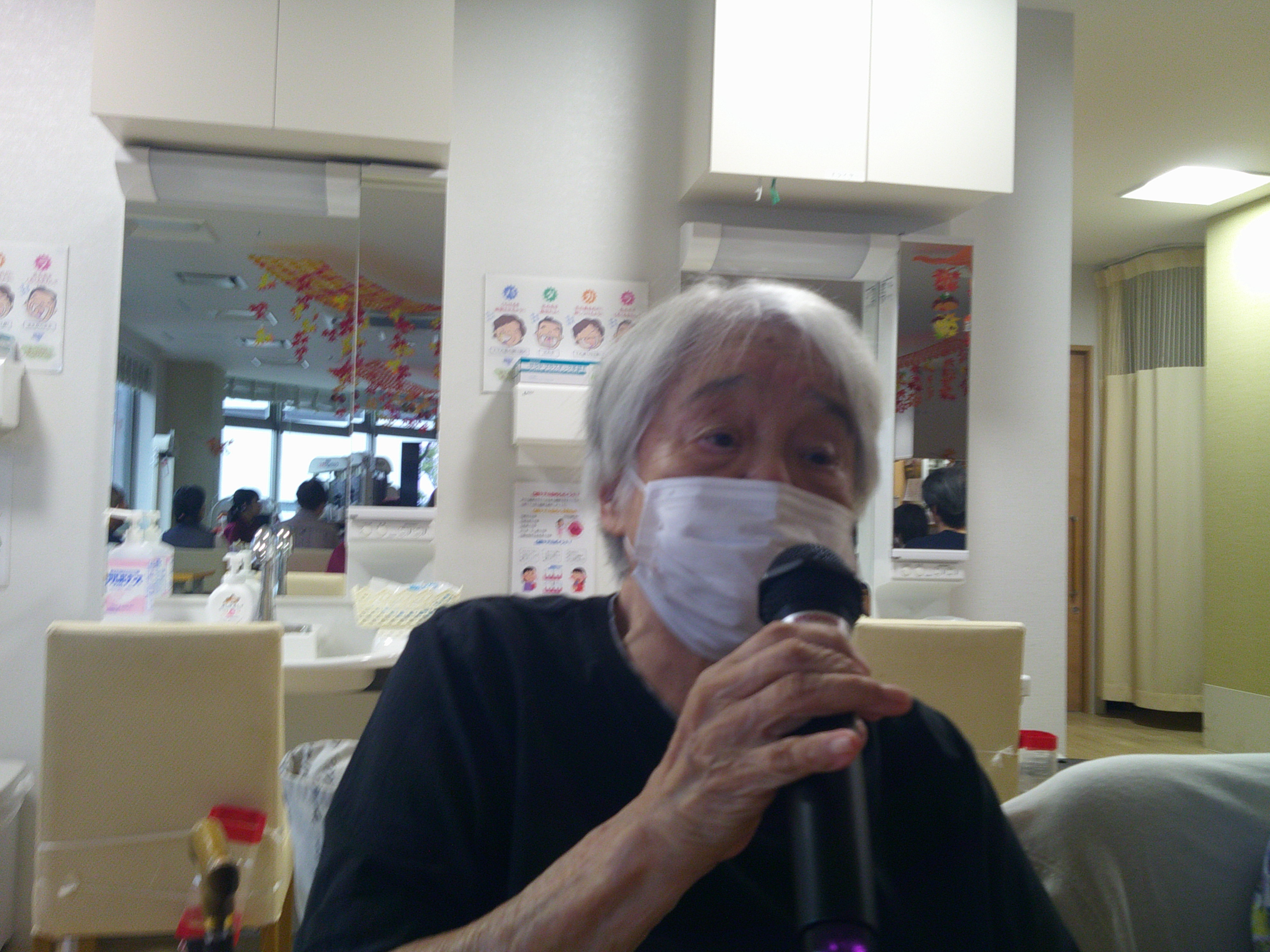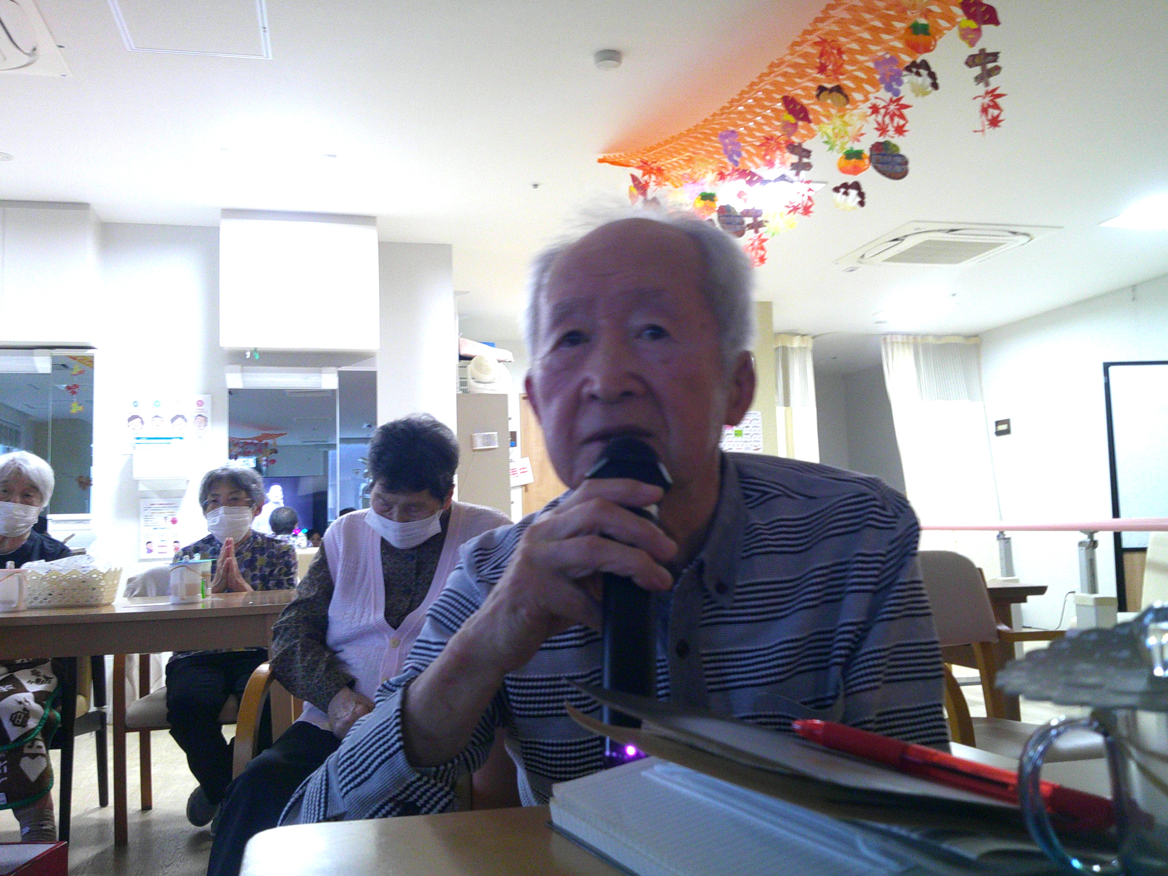 今日は、皆様と「ジェスチャーゲーム」をしました。職員がジェスチャーをし、皆様に当てて頂きます。例えば「ゾウ」「ゴリラ」「カニ」等は、簡単です。難しいのは、「ダンゴムシ」「カヌー」です。中々答えが出ませんでした。「田植え」では、職員が靴を飛ばしてしまい、大笑いでした。楽しい時間となりました(^-^)
