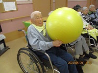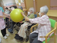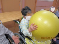 自分の顔が隠れてしまうほどのバランスボールを使って、お隣へボールを渡していくゲームをしました。