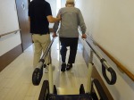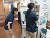 施設にある給茶機が少し調子が悪かったみたいで、栄養士のD井さんが機械の中身を確認しているのを後ろから見守る介護サブリーダーS井さんの写真です。