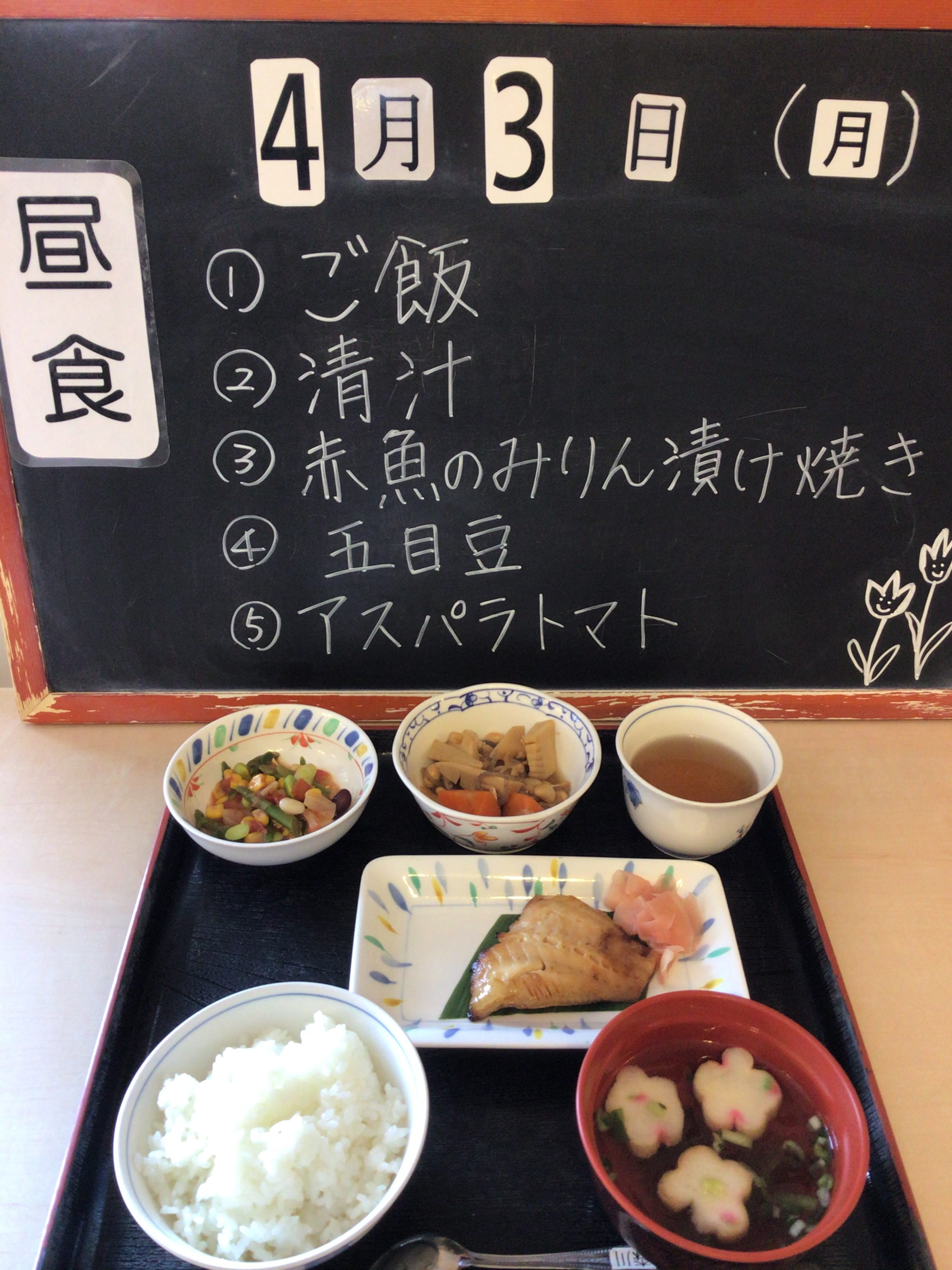 献立のメニューは、赤魚のみりん漬け焼きと五目豆、アスパラトマトです。