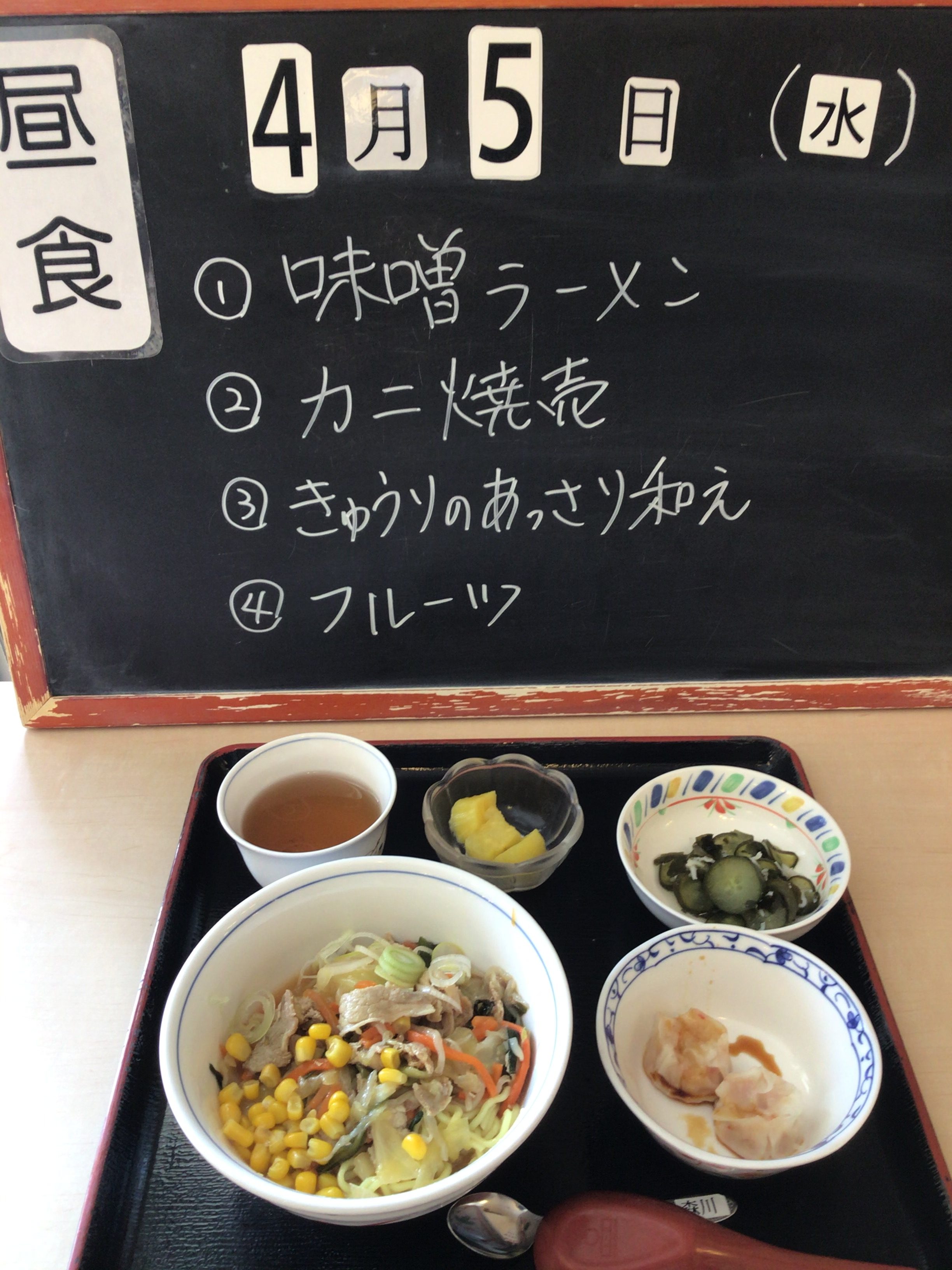 献立のメニューは、味噌ラーメンとカニ焼売、きゅぅりのあっさり和えにフルーツ付きです。