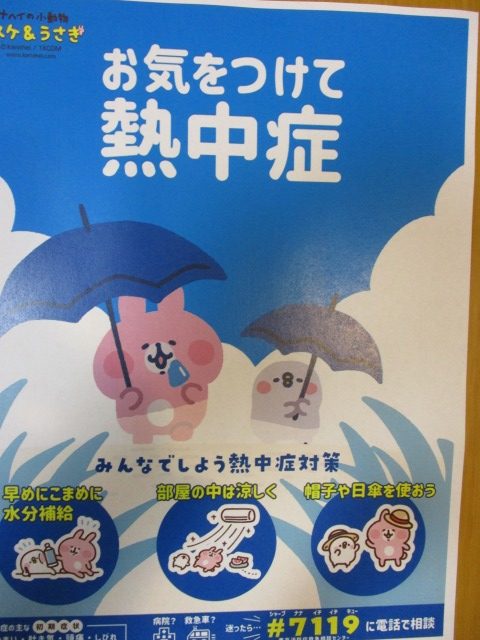 ここ数日、猛暑日が続いて全国的に熱中症で救急搬送される方が増えています。中でも半数の方はご高齢の方だという事です。のどが渇いていなくてもこまめに水分補給をして熱中症を予防しましょう!