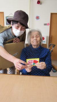 スタッフが、男はつらいよのフーテンの寅さんに扮して、お決まりの口上を披露♪ 手作りトランクの中からお一人お一人に寅さんから父の日母の日のカードをプレゼントし、記念撮影を行いました(#^.^#)
