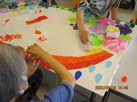 今日の午後は壁面制作を行いました。紫陽花の花は出来上がっているので「虹」の制作をしていただきました。折り紙を手で切る方と切ってある折り紙を糊で貼る方と分かれてもらいました。皆さん隣の方と話をしながらテキパキと進めていかれたのでオレンジ色まで終わりました。切る方はどんどん切って紫まで仕上げていました。次回の制作で虹がどこまで進むか楽しみですね(^^♪