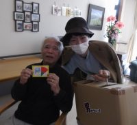 スタッフが、男はつらいよのフーテンの寅さんに扮して、お決まりの口上を披露♪ 手作りトランクの中からお一人お一人に寅さんから父の日母の日のカードをプレゼントし、記念撮影を行いました(#^.^#)