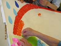 今日の午後は壁面制作を行いました。紫陽花の花は出来上がっているので「虹」の制作をしていただきました。折り紙を手で切る方と切ってある折り紙を糊で貼る方と分かれてもらいました。皆さん隣の方と話をしながらテキパキと進めていかれたのでオレンジ色まで終わりました。切る方はどんどん切って紫まで仕上げていました。次回の制作で虹がどこまで進むか楽しみですね(^^♪