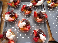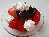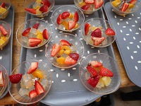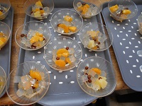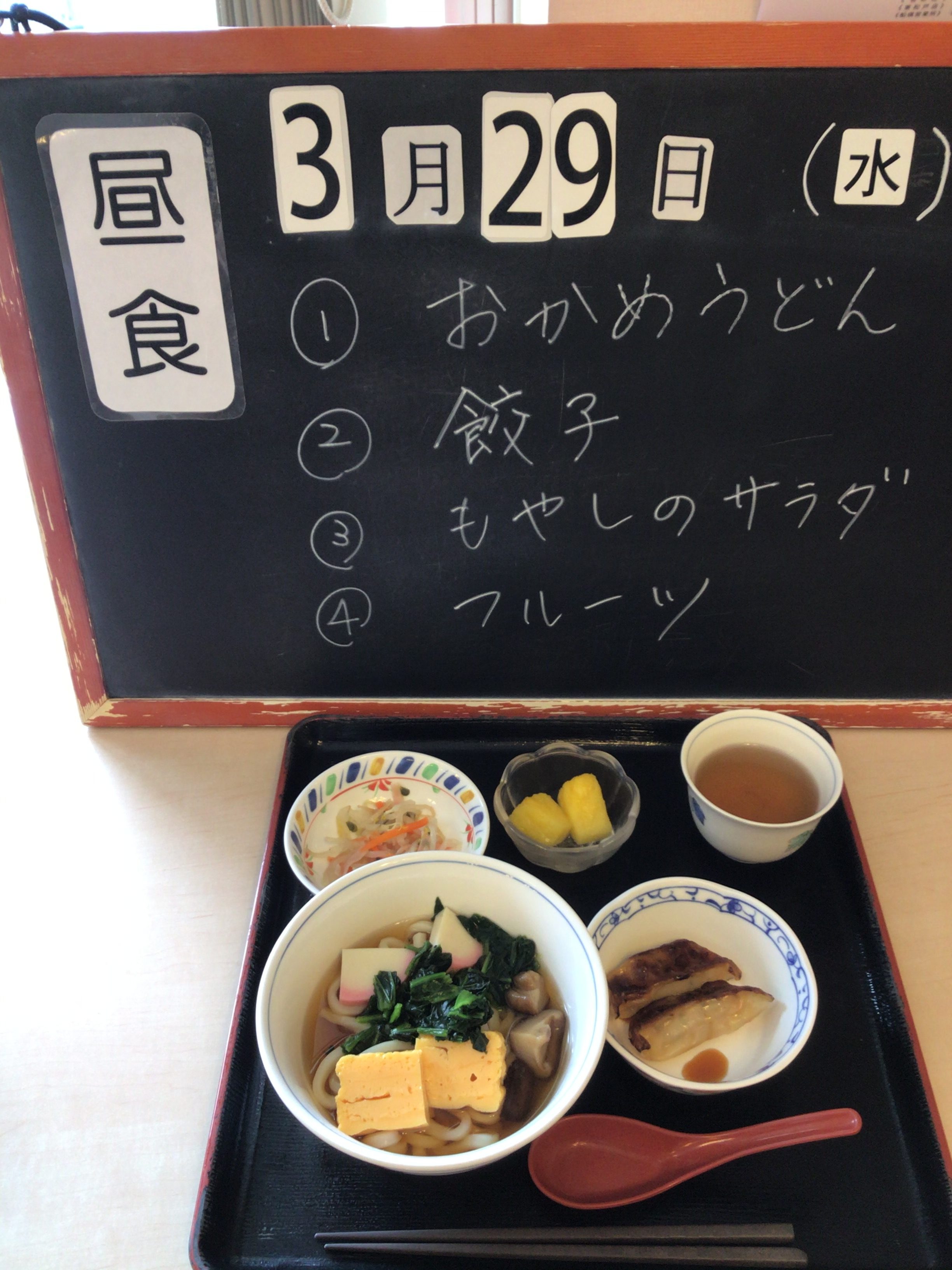 献立のメニューは、おかめうどんと餃子、もやしサラダにフルーツ付きです。