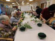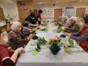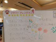 機能訓練指導員がホワイトボードに花の名前と絵を描いてくださりひとつひとつ確認しながら活けていらっしゃいました。今回は黄色のバラが皆様のお気に入りのようでした。心を込めて活けたアレンジメントの完成にご満足されていました。