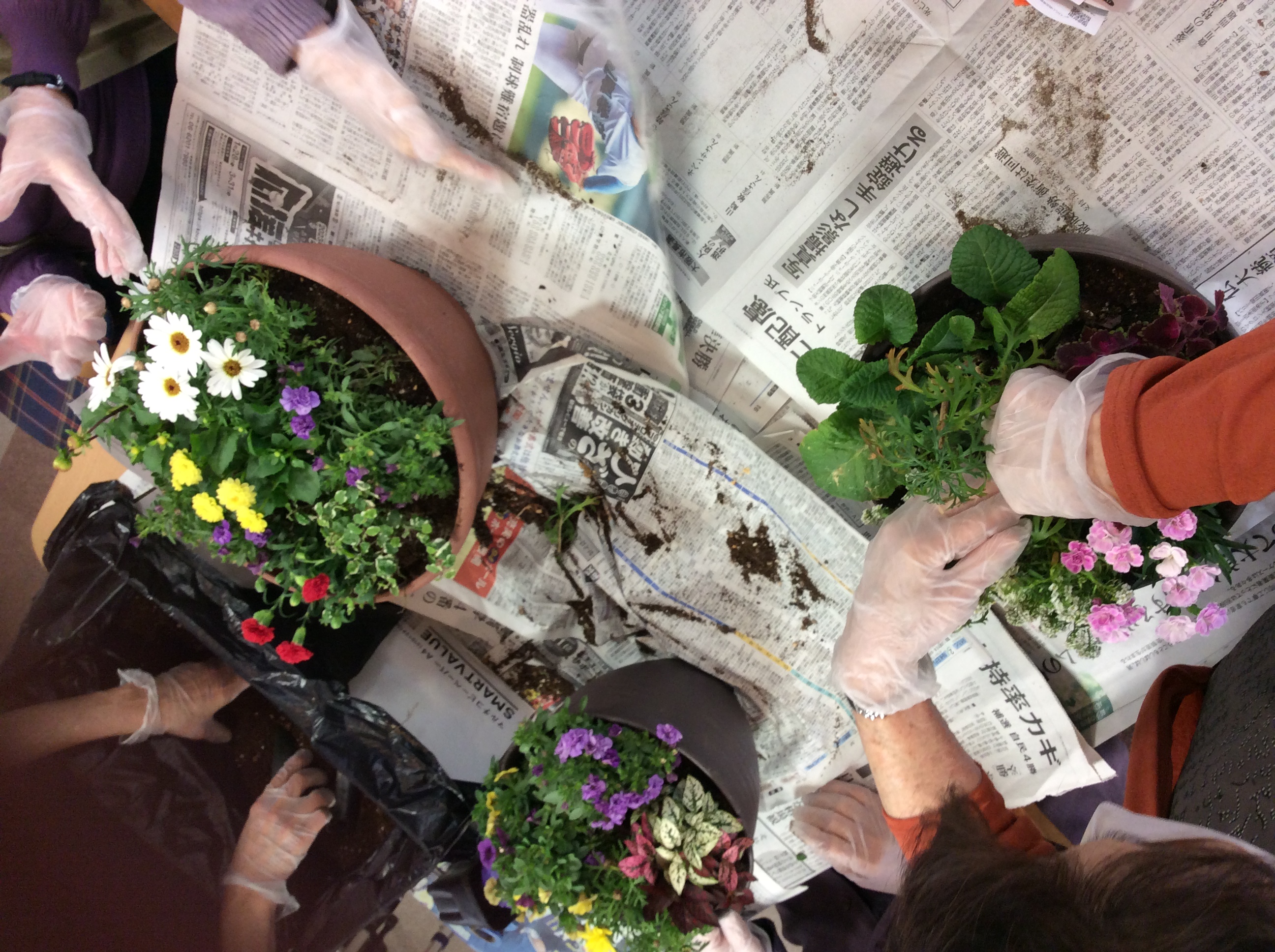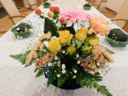 機能訓練指導員がホワイトボードに花の名前と絵を描いてくださりひとつひとつ確認しながら活けていらっしゃいました。今回は黄色のバラが皆様のお気に入りのようでした。心を込めて活けたアレンジメントの完成にご満足されていました。