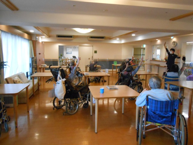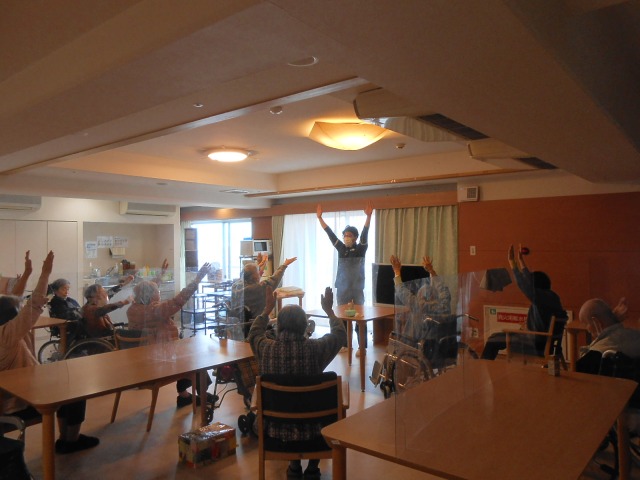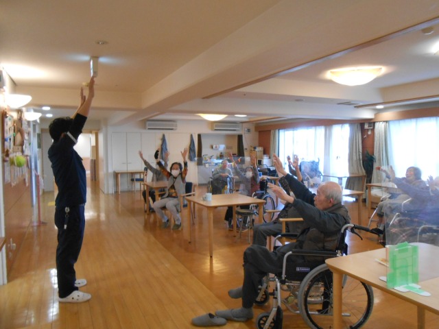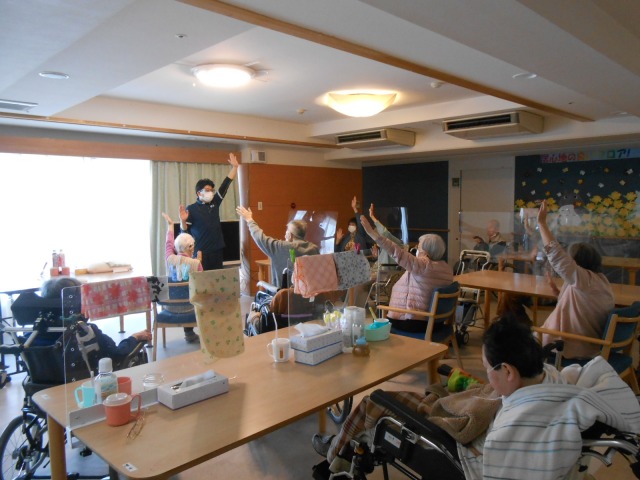 今日の機能訓練は、はじめに北国の春に合わせて音楽体操。