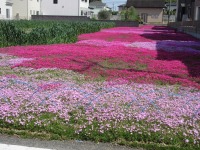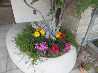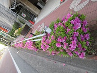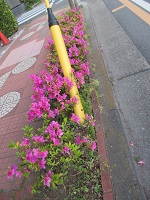 施設が工事中のため、黒い布がかかってしまっており、外の様子が見られない毎日を過ごしていただいています。玄関から出ればこの通り、きれいな花壇のお花や、道路にはつつじが満開です!