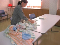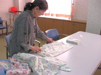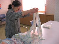 「何かお手伝いをさせて」と言ってくださった入居者様に、エプロンを畳むのを手伝っていただきました。