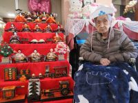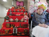 1階ロビーに飾ってあるお雛様を入居者様に見ていただきました。