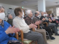 こんにちは、デイサービスです。今日は尺八、トロンボーン、サックス演奏のAKOの皆さんがコンサートに来てくださいました。水戸黄門のテーマから始まり「聖者の行進」「A列車で行こう」「僕はセンチに」などのジャズ曲をたくさん演奏してくださいました。曲名だけ聞いても?でしたが、実際に演奏を聞くと「聞いたことある」「この曲知ってる」とどこかで耳にした曲ばかりでご利用者様もとても嬉しそうにされていました。アンコール曲はコーヒールンバで全員ノリノリでした(笑)また、2月にお誕生日を迎えるご利用者様のお誕生日会だったので、AKOさんにバースデーソングの演奏をお願いすると快く引き受けてくださって、生演奏でバースデーソングを歌ってお祝いすることができました(^^♪