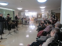 こんにちは、デイサービスです。今日は尺八、トロンボーン、サックス演奏のAKOの皆さんがコンサートに来てくださいました。水戸黄門のテーマから始まり「聖者の行進」「A列車で行こう」「僕はセンチに」などのジャズ曲をたくさん演奏してくださいました。曲名だけ聞いても?でしたが、実際に演奏を聞くと「聞いたことある」「この曲知ってる」とどこかで耳にした曲ばかりでご利用者様もとても嬉しそうにされていました。アンコール曲はコーヒールンバで全員ノリノリでした(笑)また、2月にお誕生日を迎えるご利用者様のお誕生日会だったので、AKOさんにバースデーソングの演奏をお願いすると快く引き受けてくださって、生演奏でバースデーソングを歌ってお祝いすることができました(^^♪