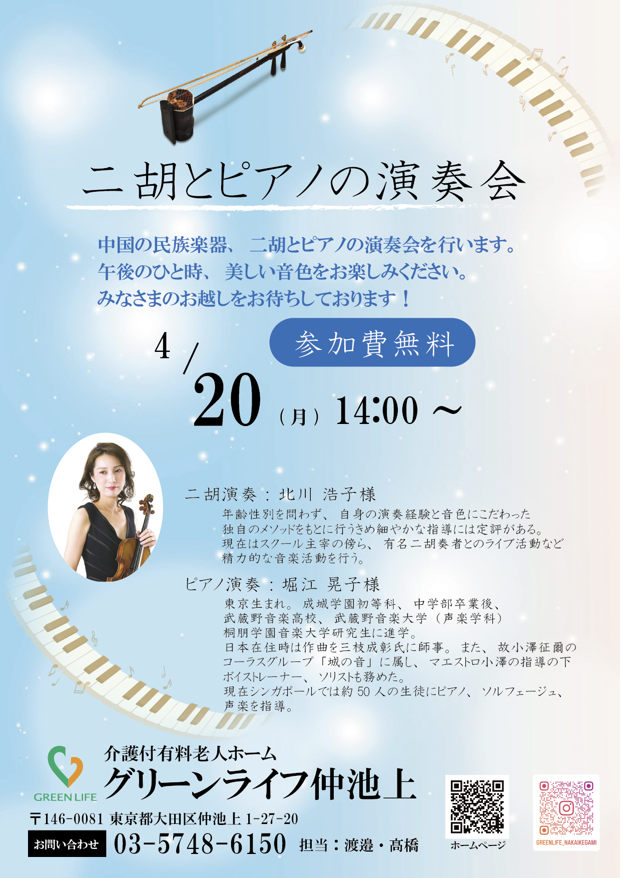 【イベント情報の訂正とお詫び】 このたび、グリーンライフ仲池上の折り込み広告に掲載した二胡&ピアノ演奏会開催日の曜日に誤りがございました。