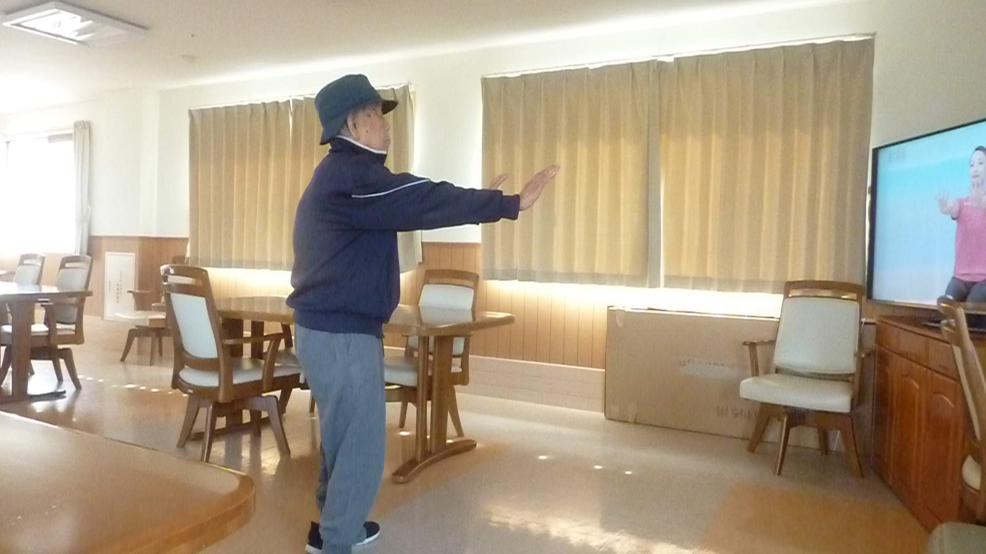 NHKの朝の体操を楽しみにされているようで、始まる前より食堂のテレビの前で待たれていました。準備体操をして今日も一日頑張りましょうね😊