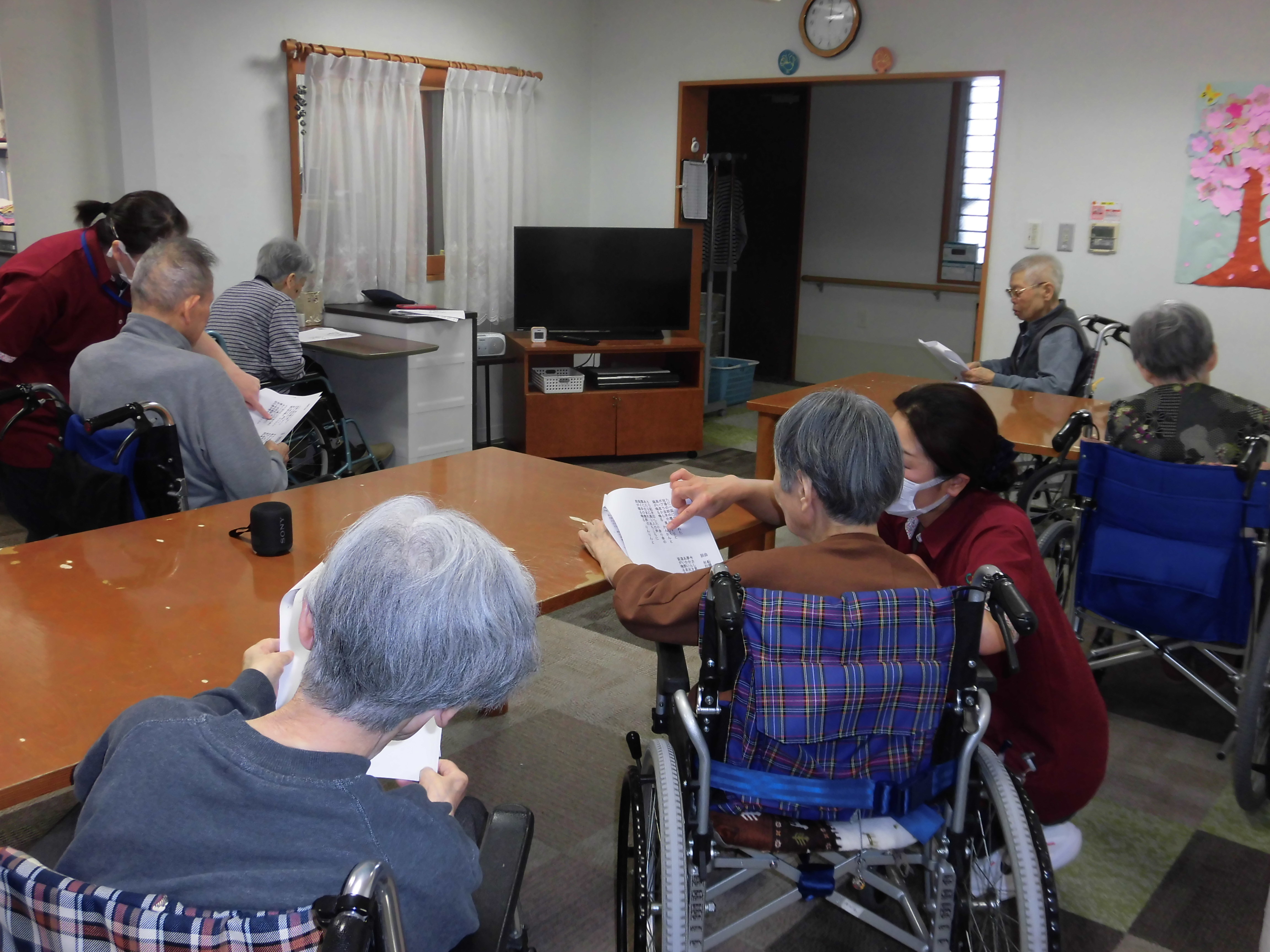 昼下がり、いつものリハビリ体操の後、入居者様と一緒にレクリエーションを行いました。