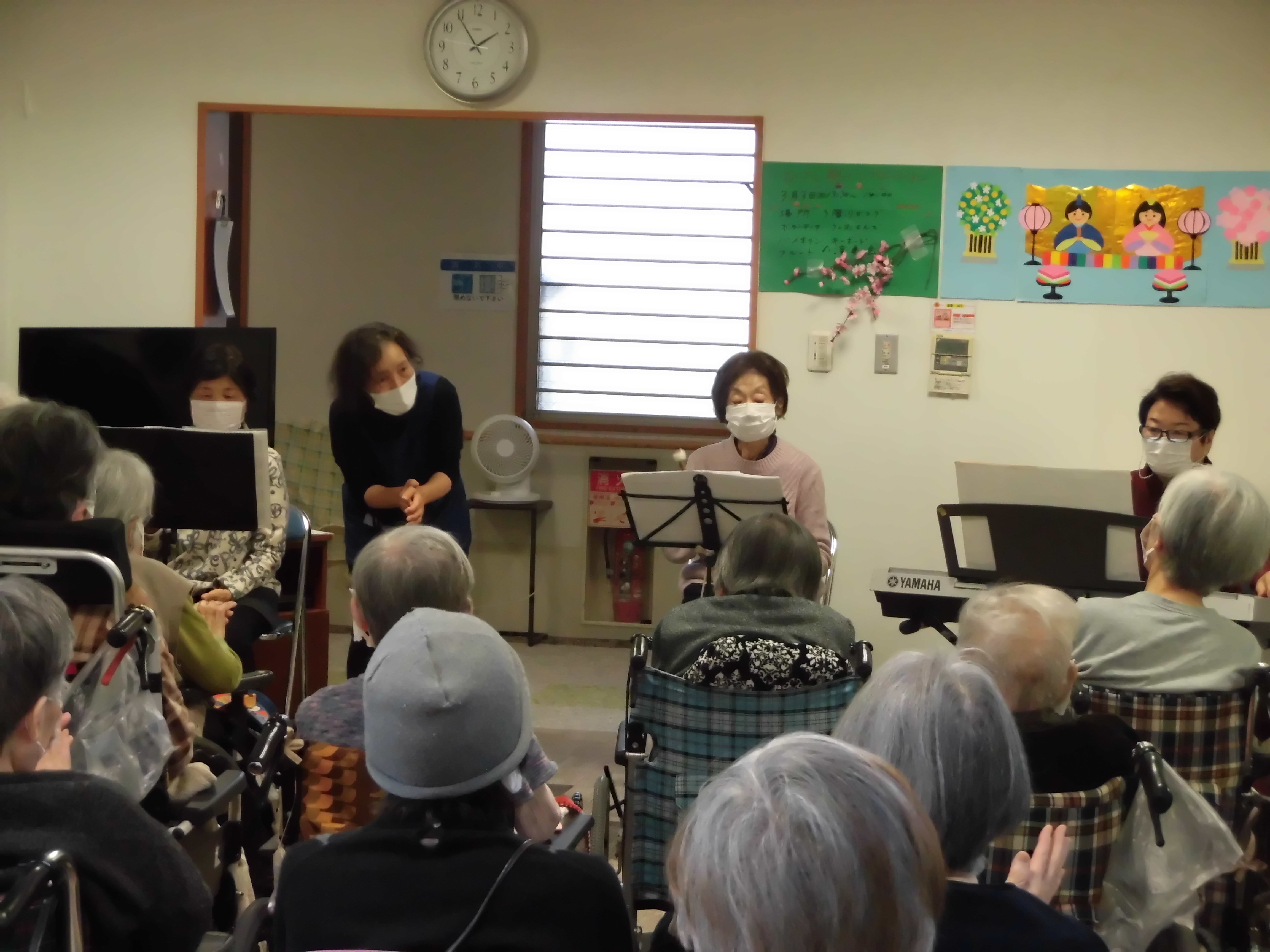 3日にひな祭りのレクレーションでボランティアの方に演奏して頂きました。その様子を報告したいと思います。