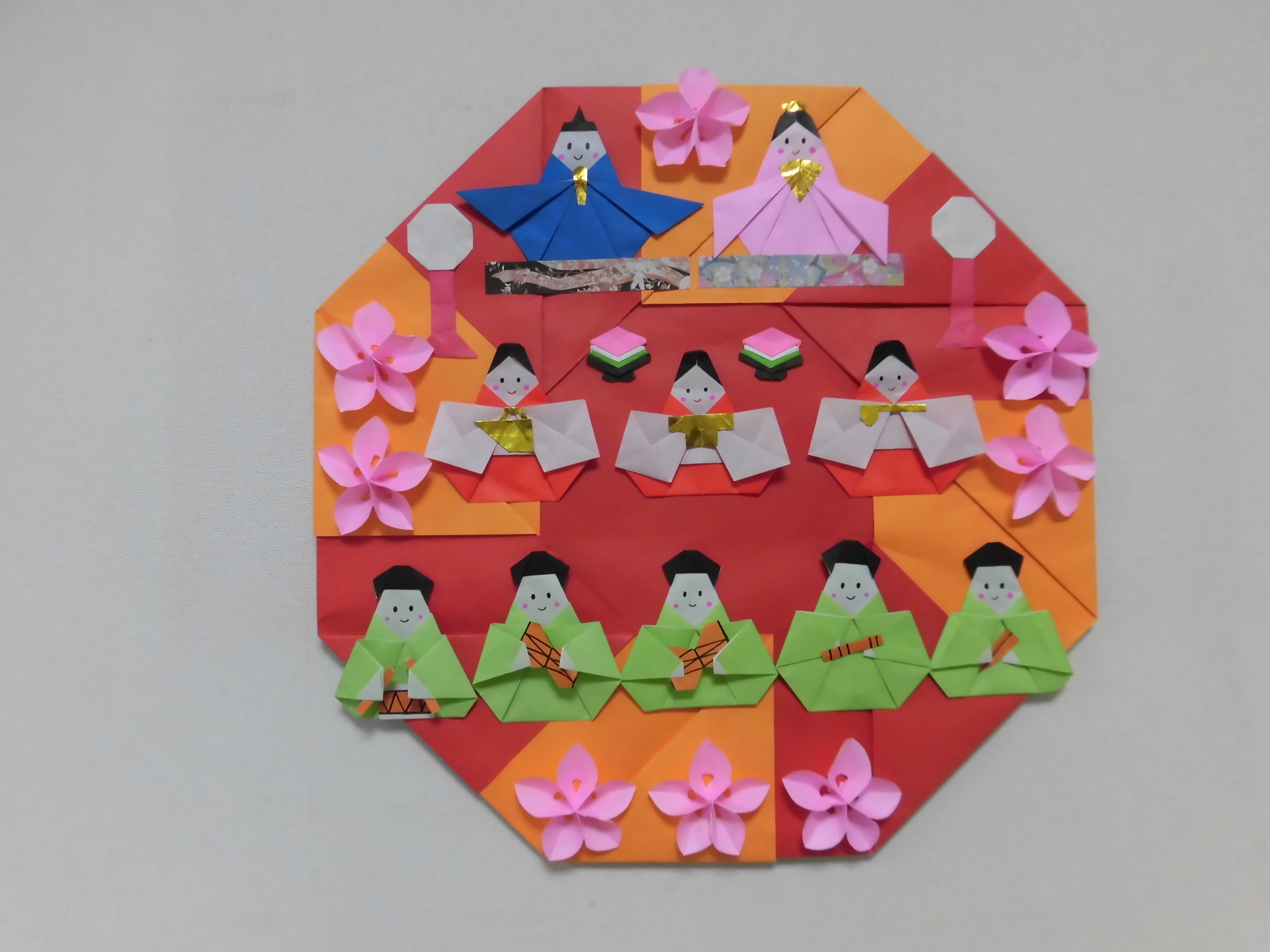 明日は、ひな祭りのレクレーションがあるので、今日は一階リビングルームに飾ってある紙製のお雛様をご紹介させていただきます。
