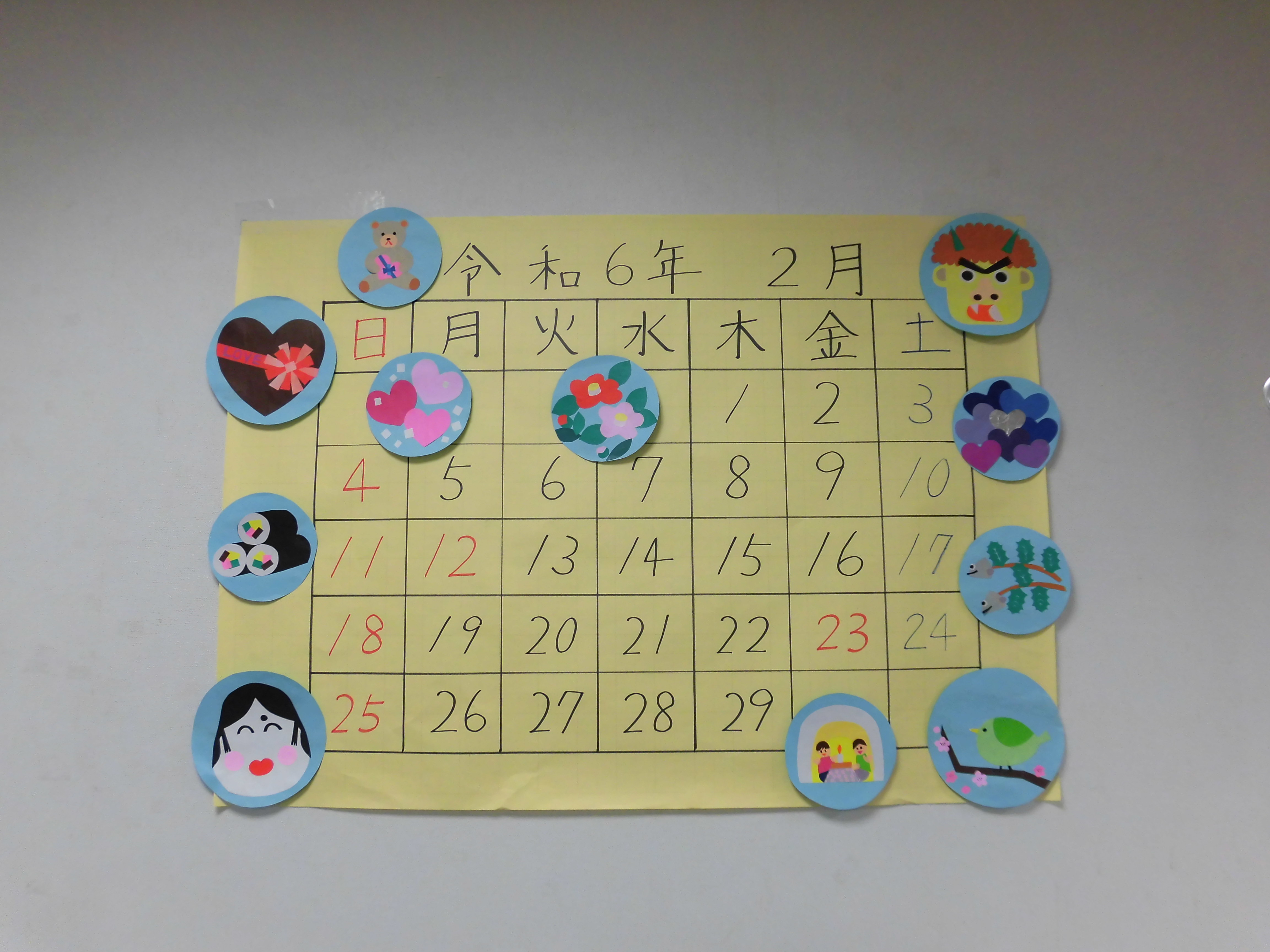 さて、ご紹介するのが遅くなりましたが、当ホームのスタッフ手作りの2月のカレンダーです。