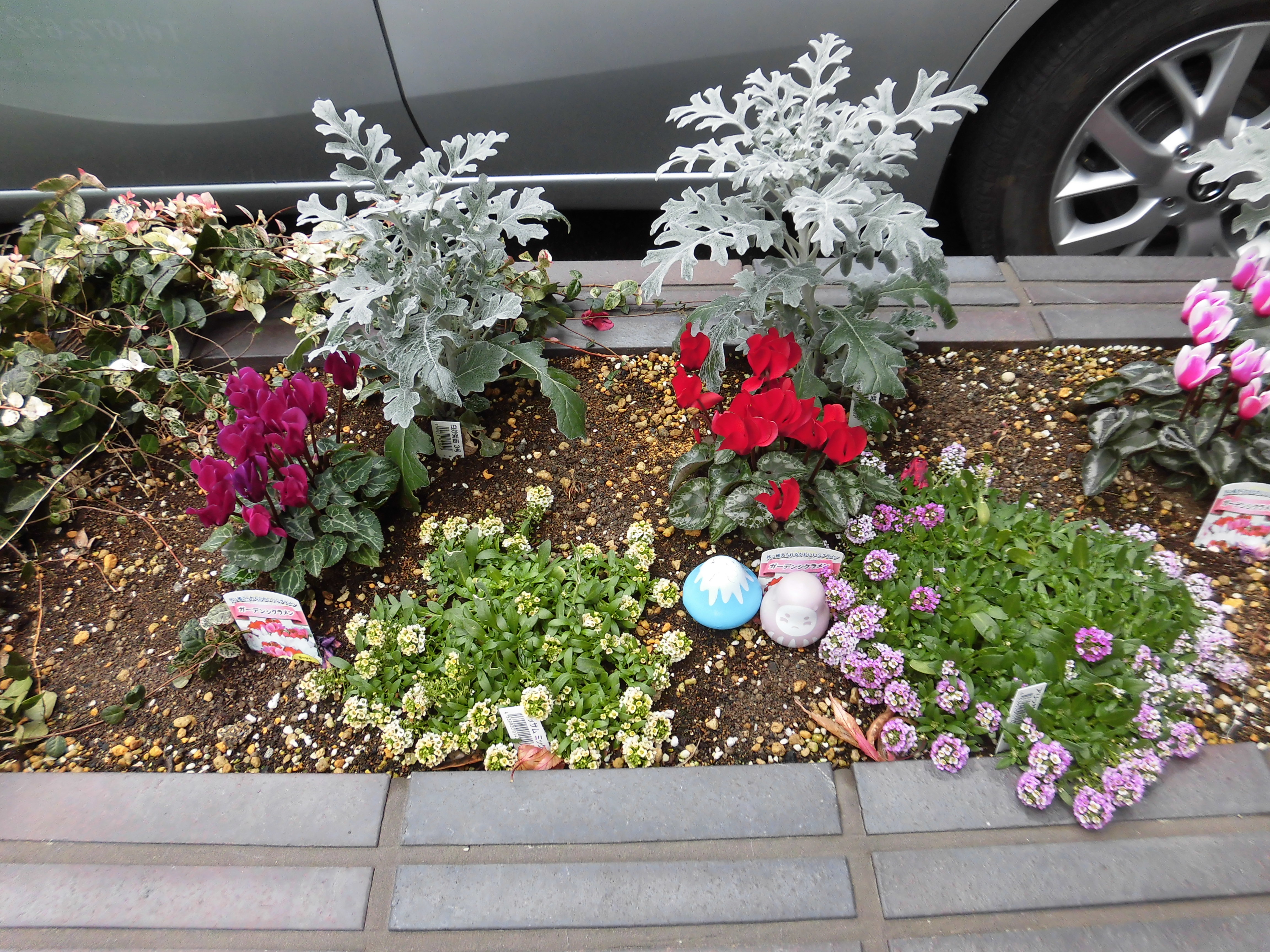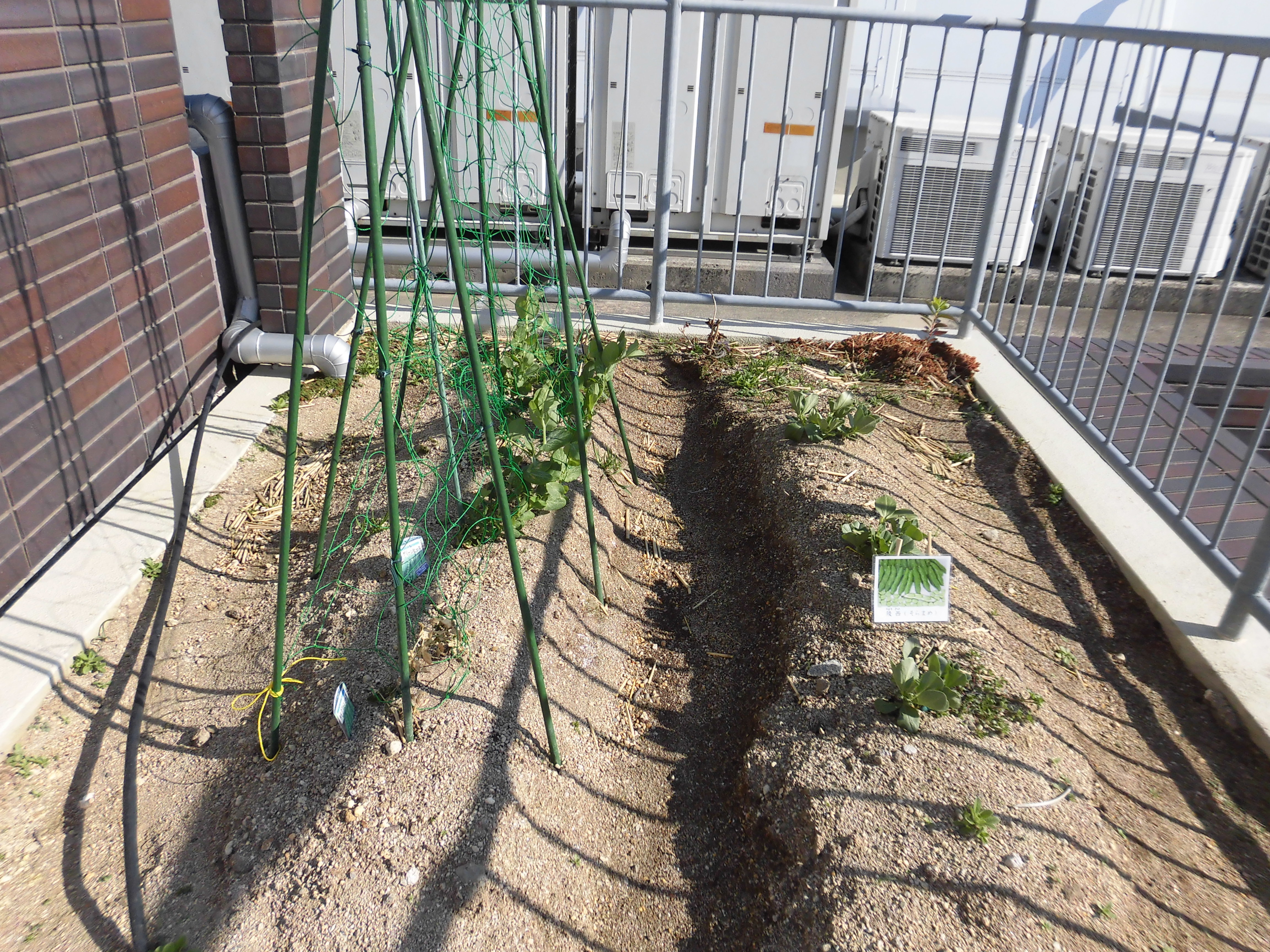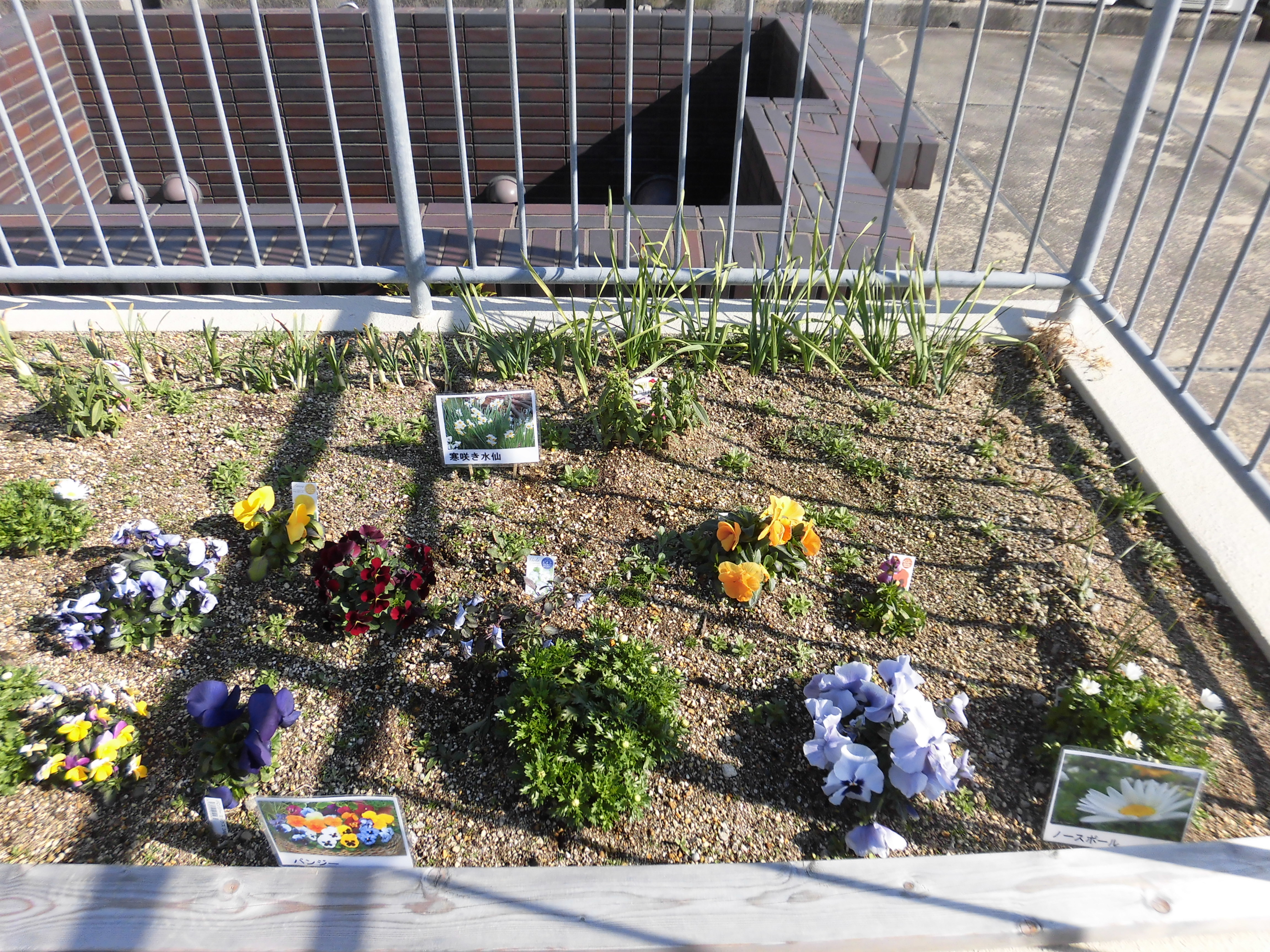 そんな中でも屋上庭園の冬のお花たちは元気に成長しています。そらまめの仲間も少しずつですが大きくなりました。