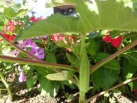 朝顔は花を咲かせ、狭くなった支柱から、あの手この手を伸ばして屋上柵に広がっています。