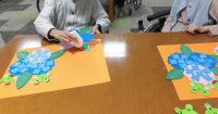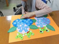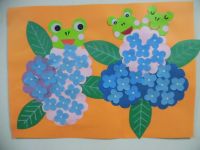 小さな花びらを一枚ずつ貼り青い紫陽花の花を作り、花の影からひょっこりと覗くカエルが可愛らしいですね。