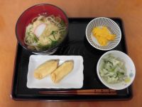 本日の献立は「稲荷寿司」「あんかけ卵とじうどん」「大根といかの炒め物」「かぼちゃのサラダ」です。